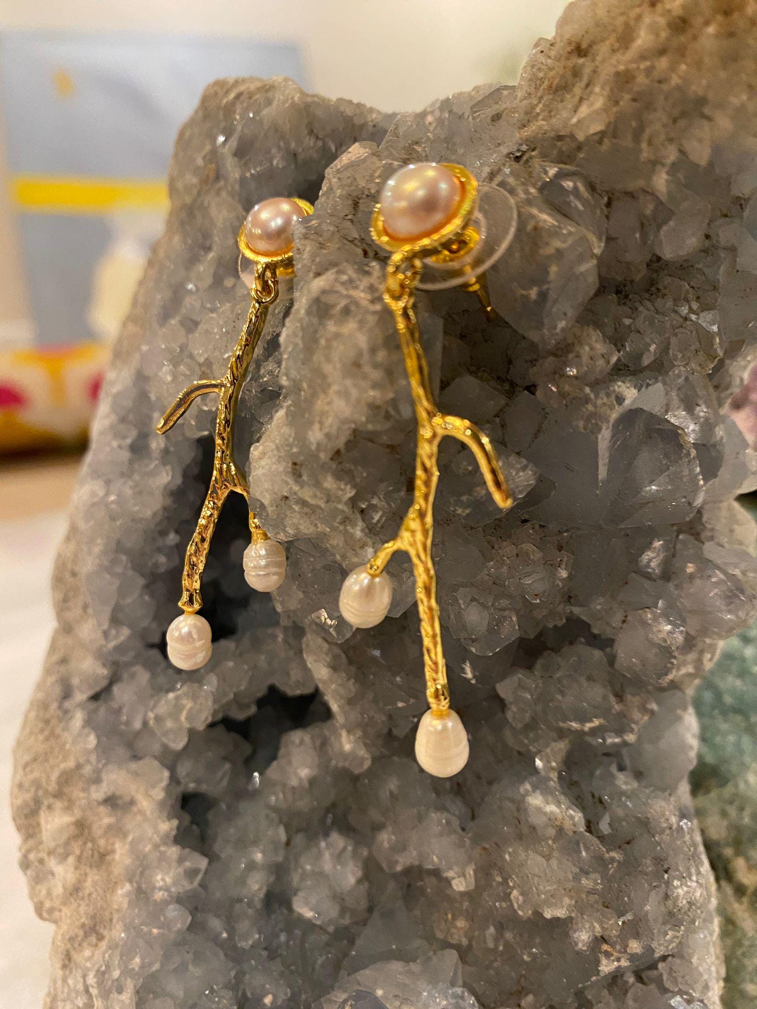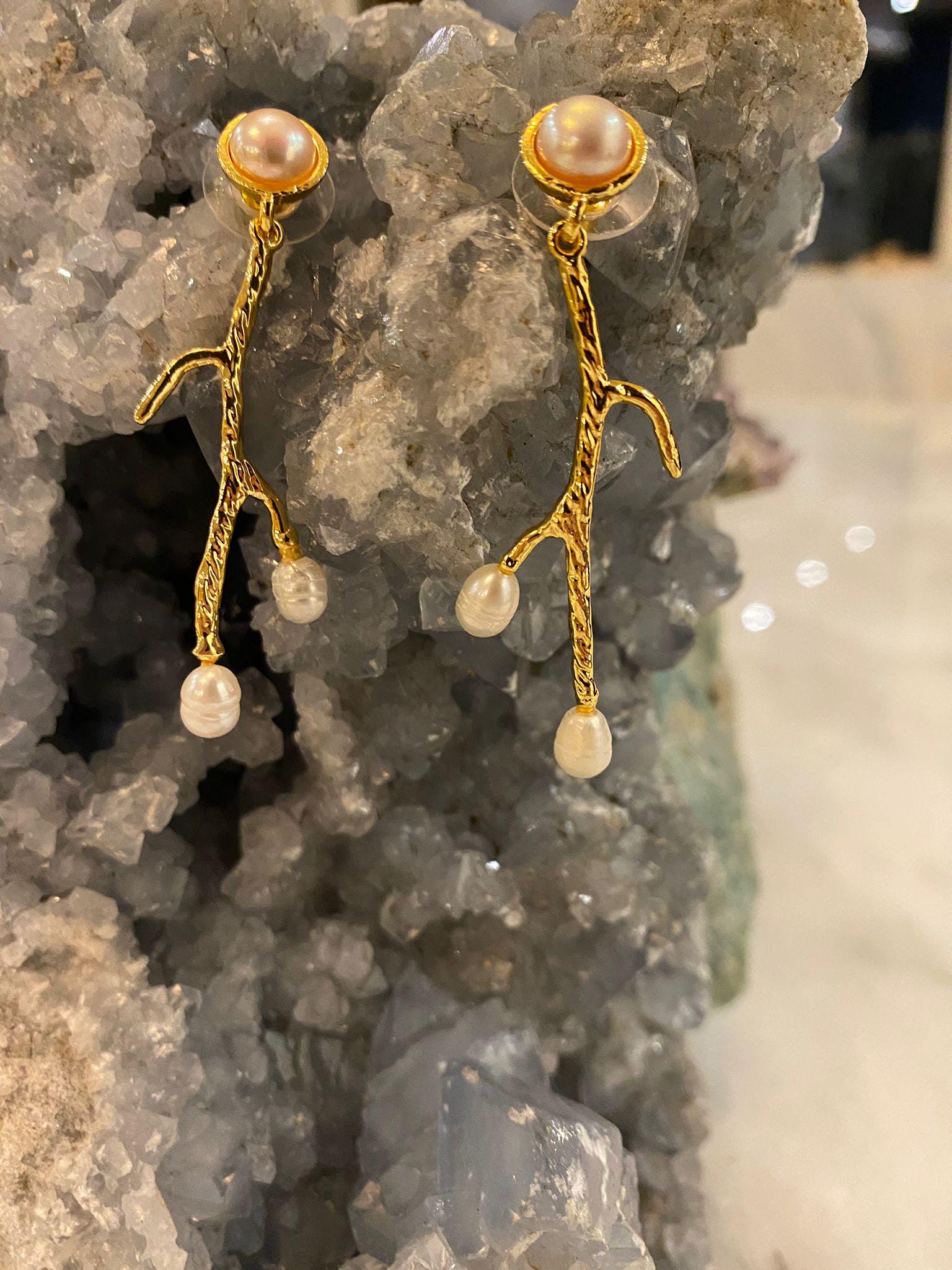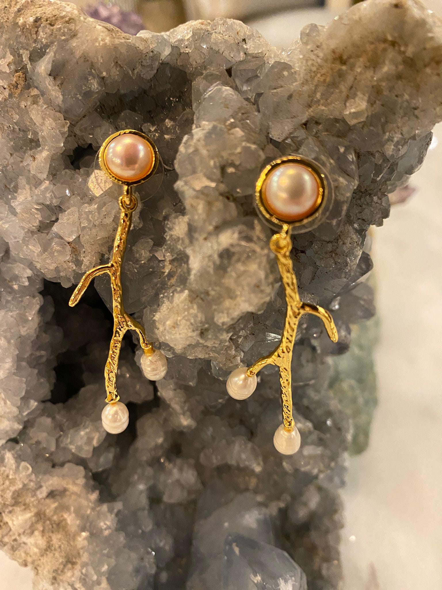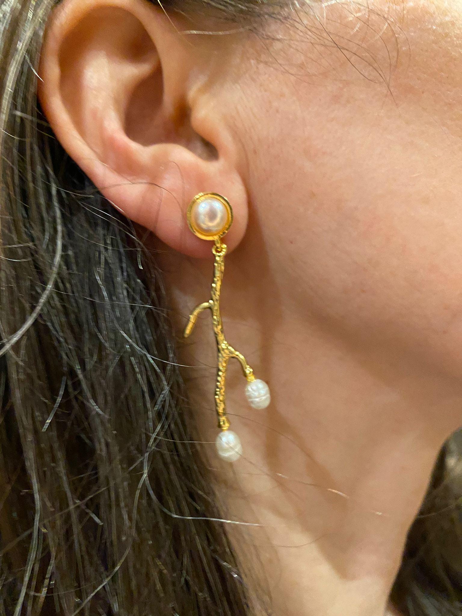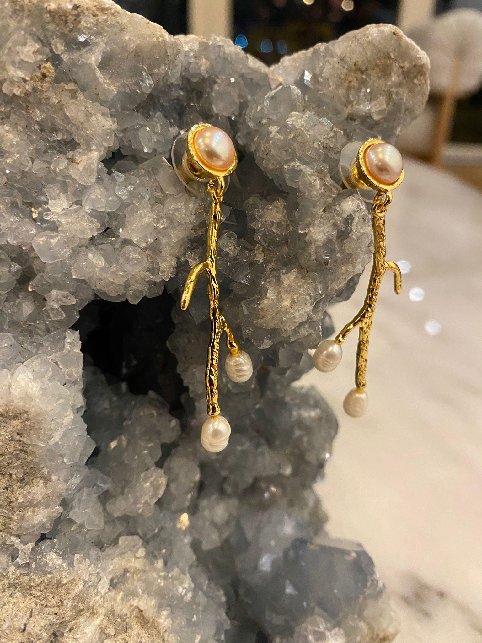 5 cm long dangling earrings. Bronze gold plated, handmade freshwater pearl earrings with branch design;