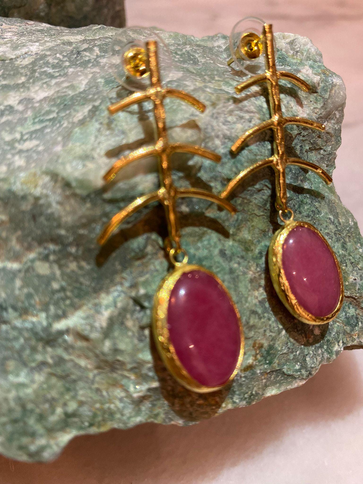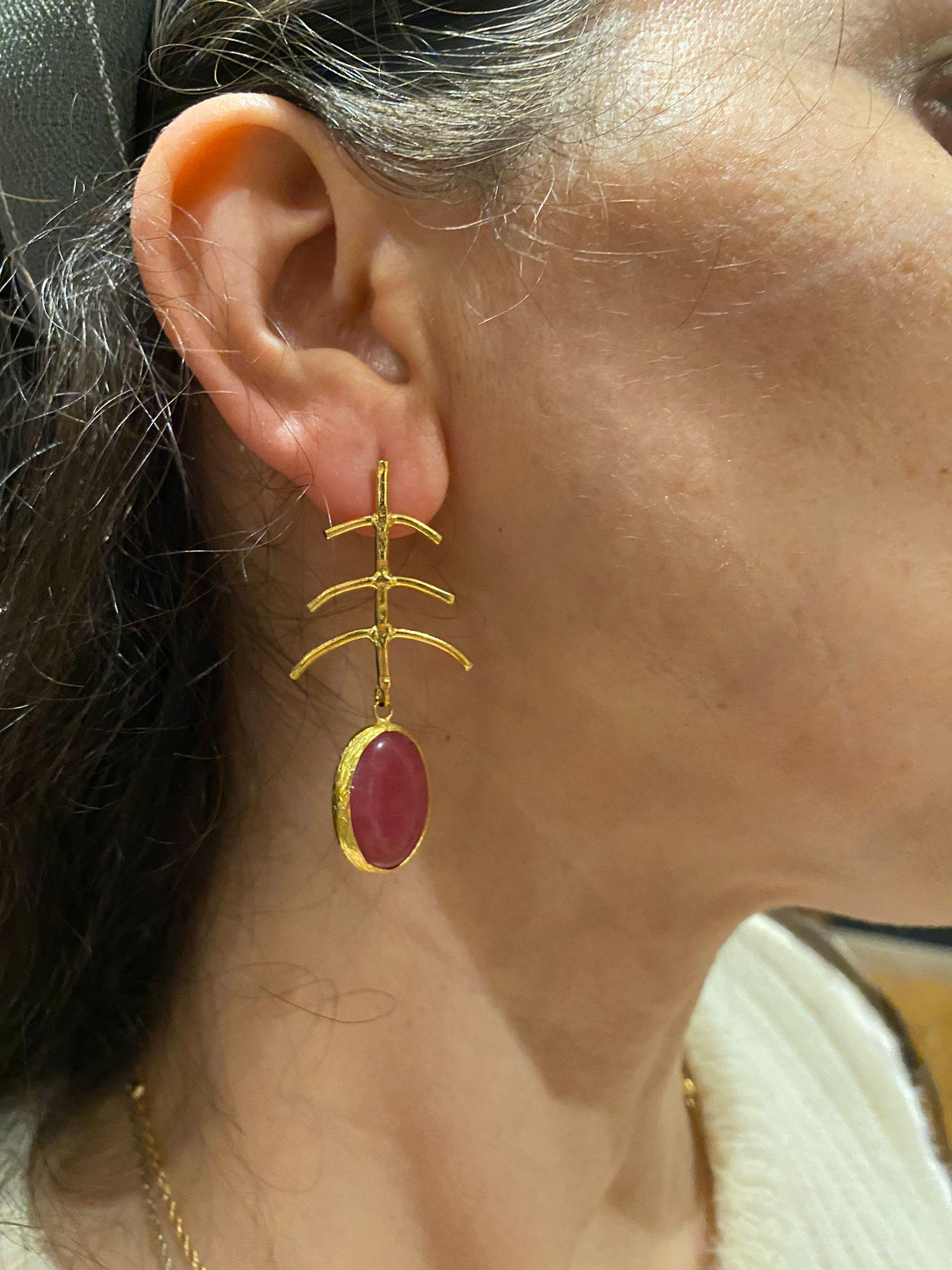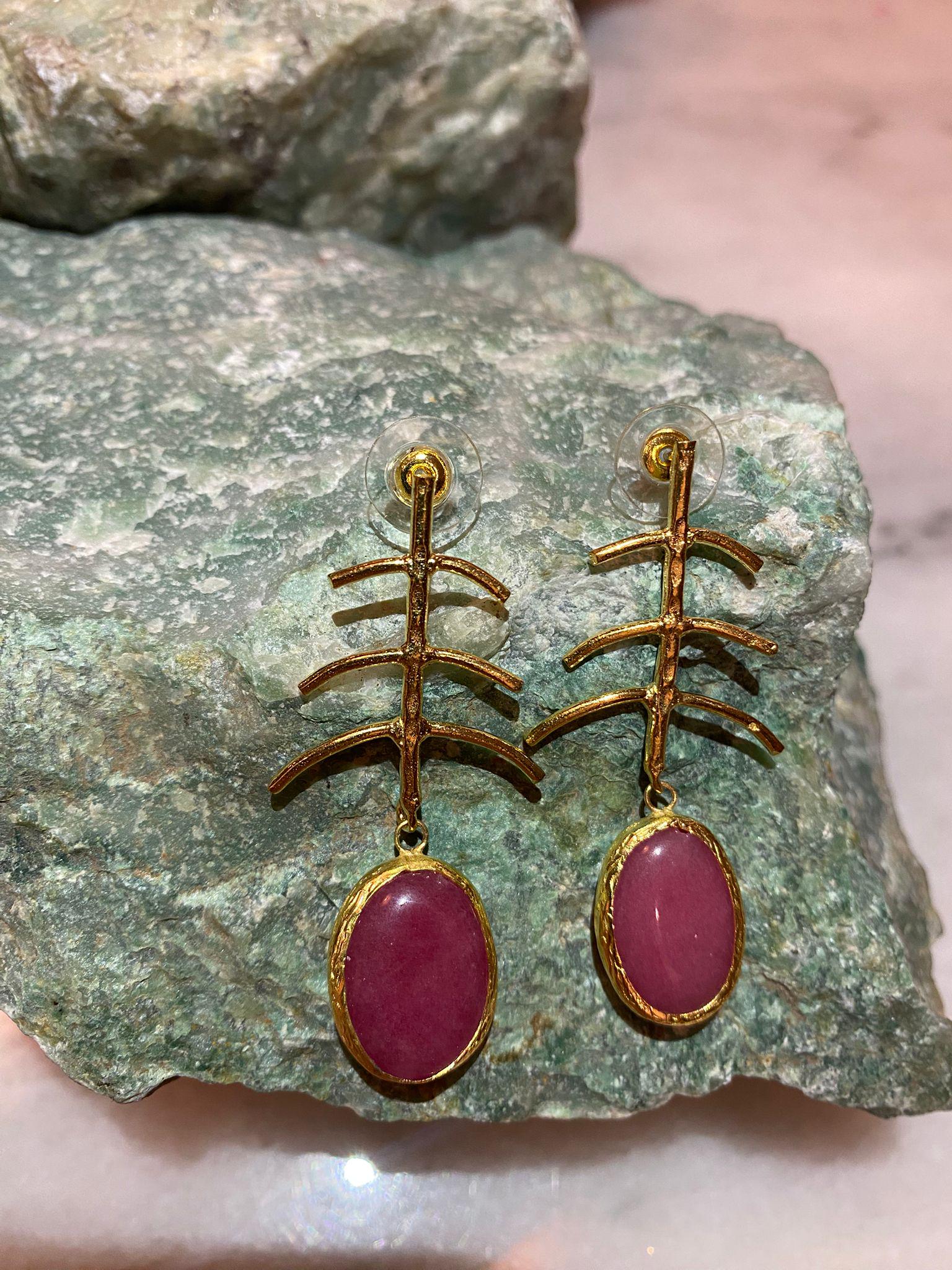 5.cm long, 1.3cm wide, gold-plated bronze, granet natural stone, fishbone motif drop earrings.