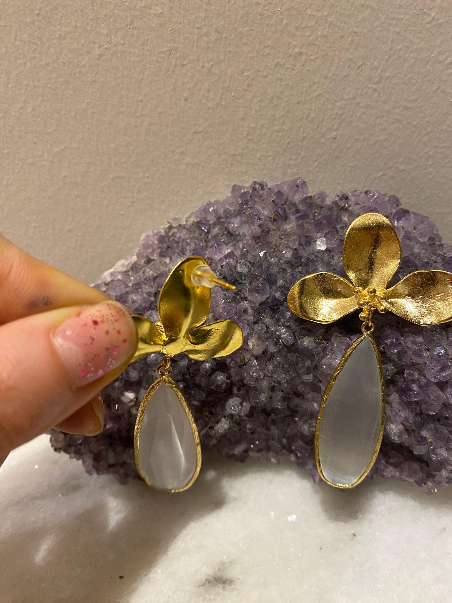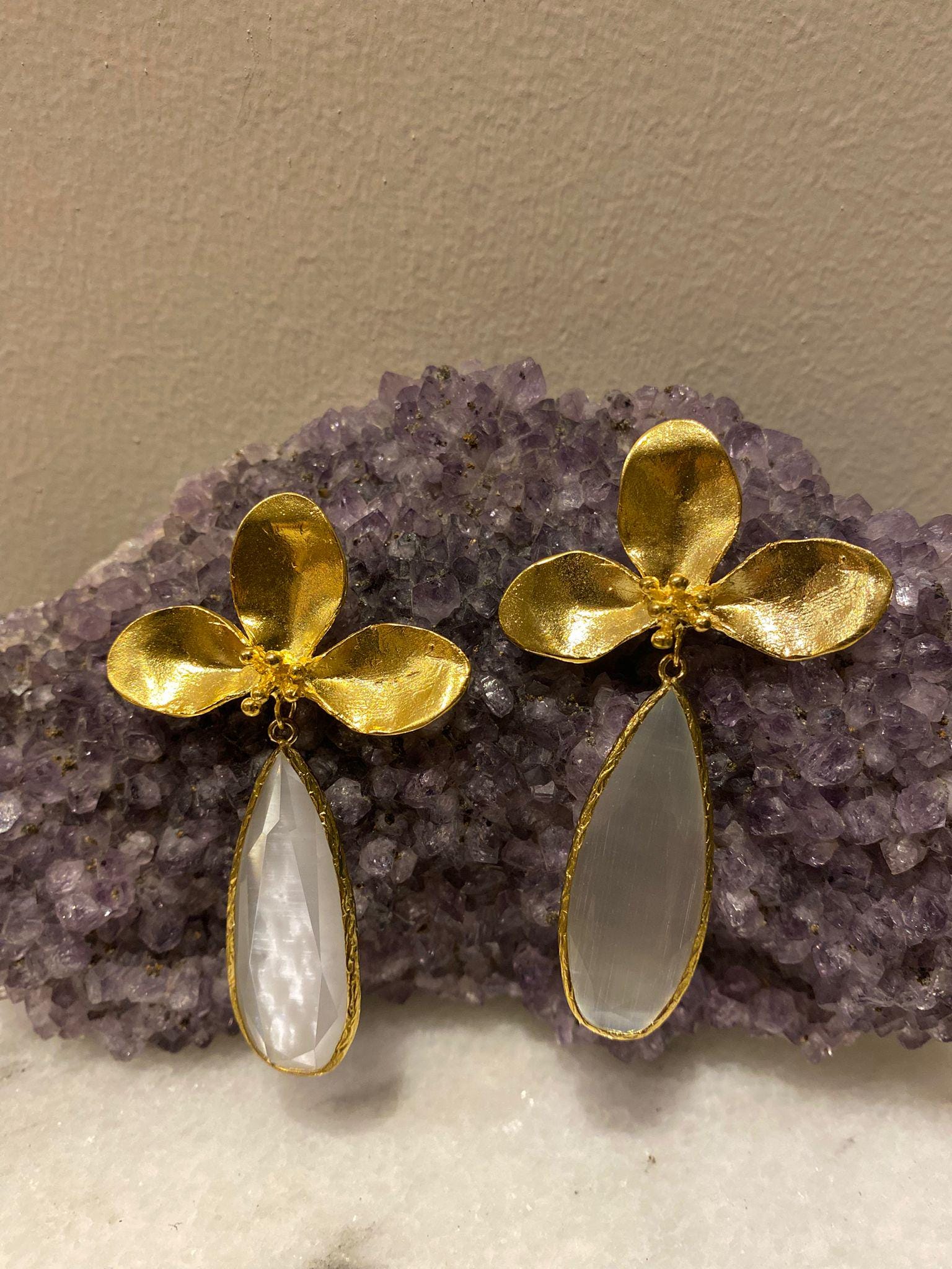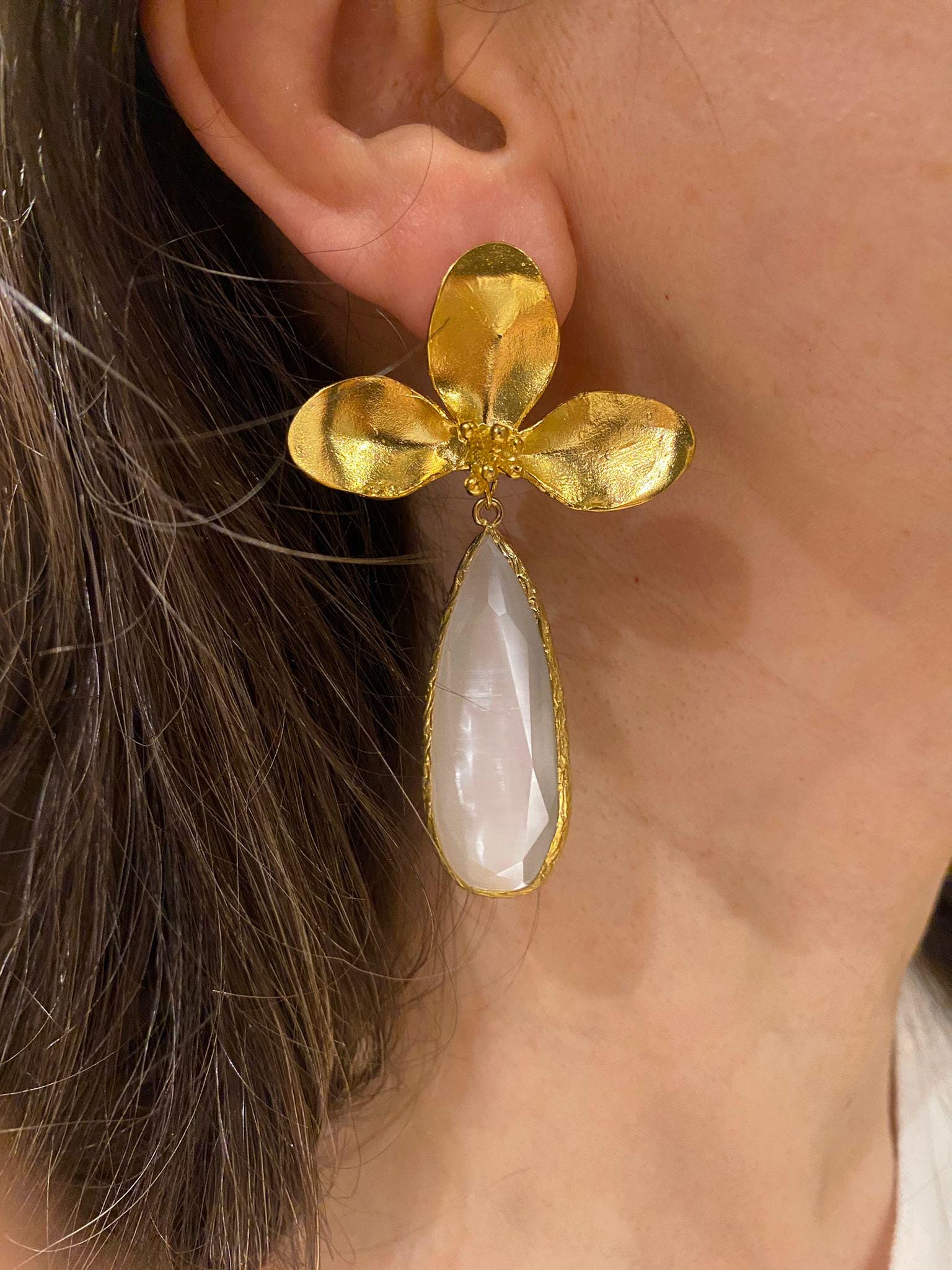 Earrings with gold-plated bronze flower motifs and white cat's eye stones. Since it is a cat's eye stone, its color changes with light reflections.