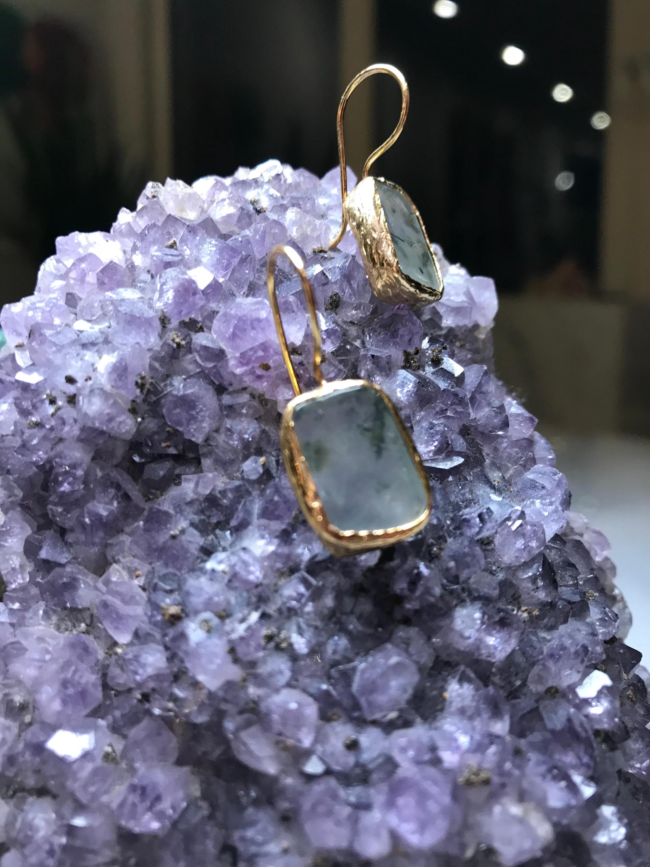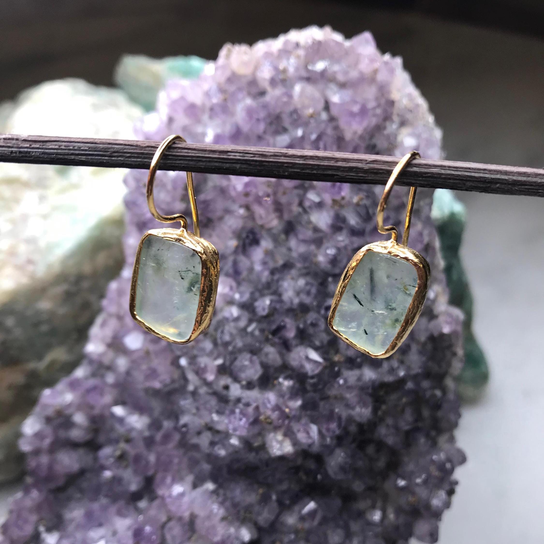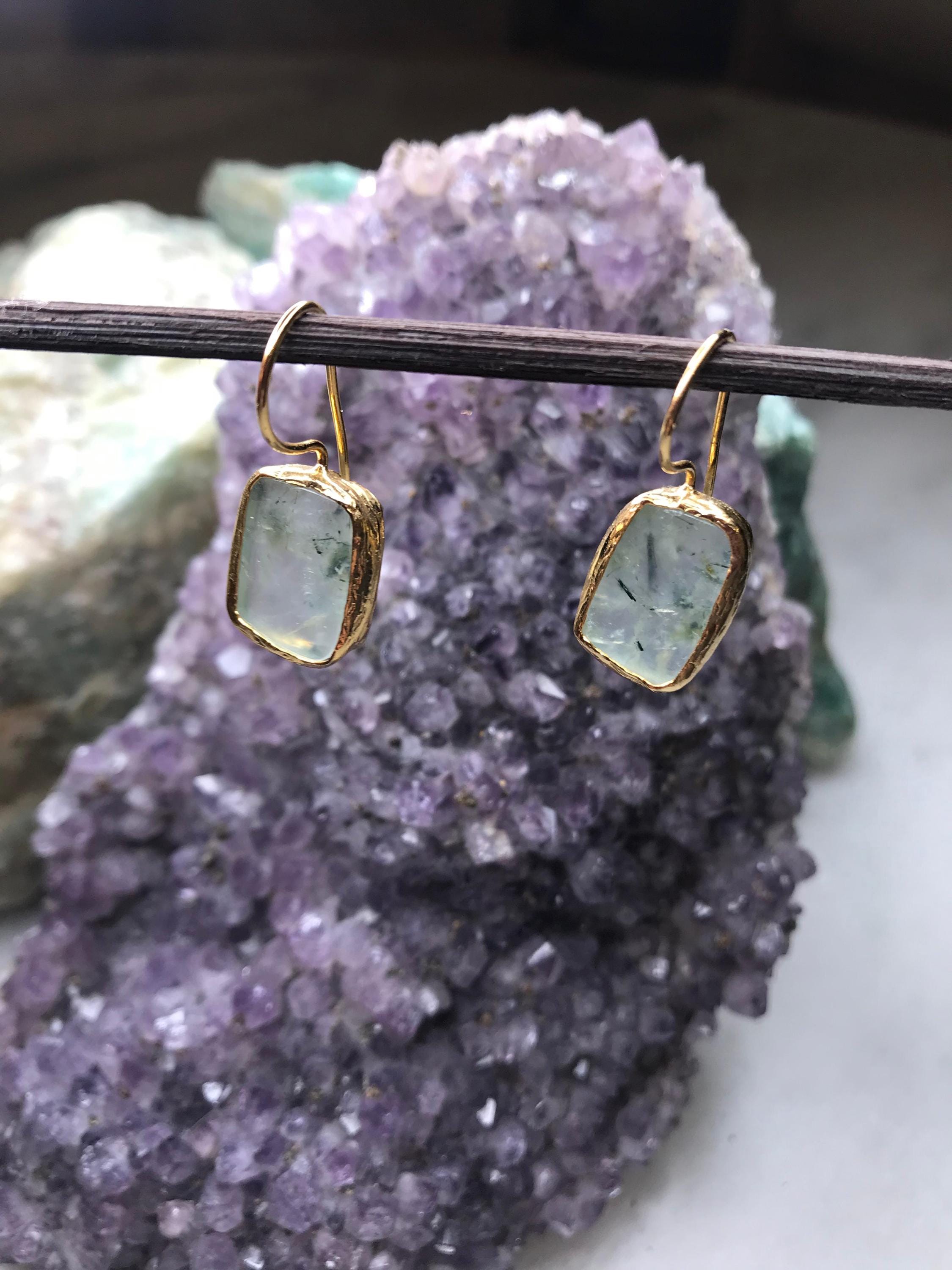 Presenting the Prehnite Stone Earrings, a symbol of endless respect and love. These earrings, crafted with prehnite stones set on bronze with gold plating, measure 2.4 cm in length and 1 cm in width. They are also hypoallergenic, ensuring comfort for sensitive skin.