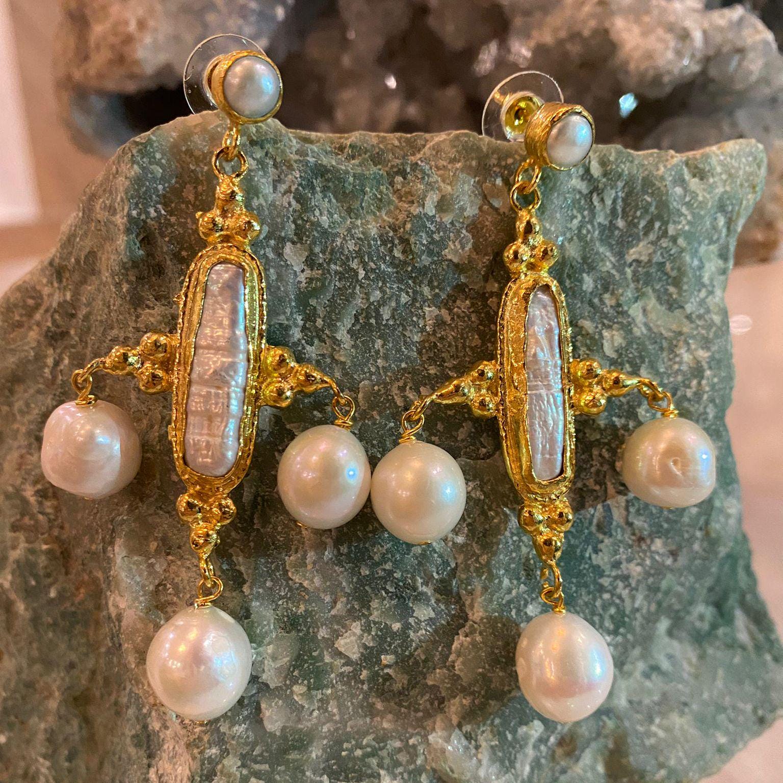 - Exquisitely handcrafted earrings with freshwater pearls, gold-plated over bronze.
