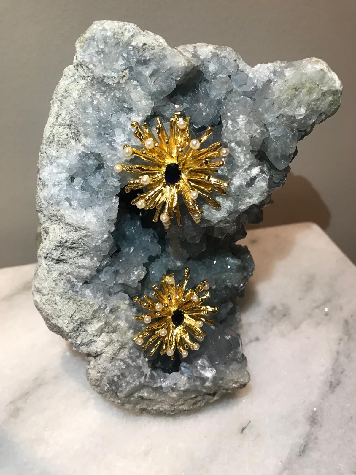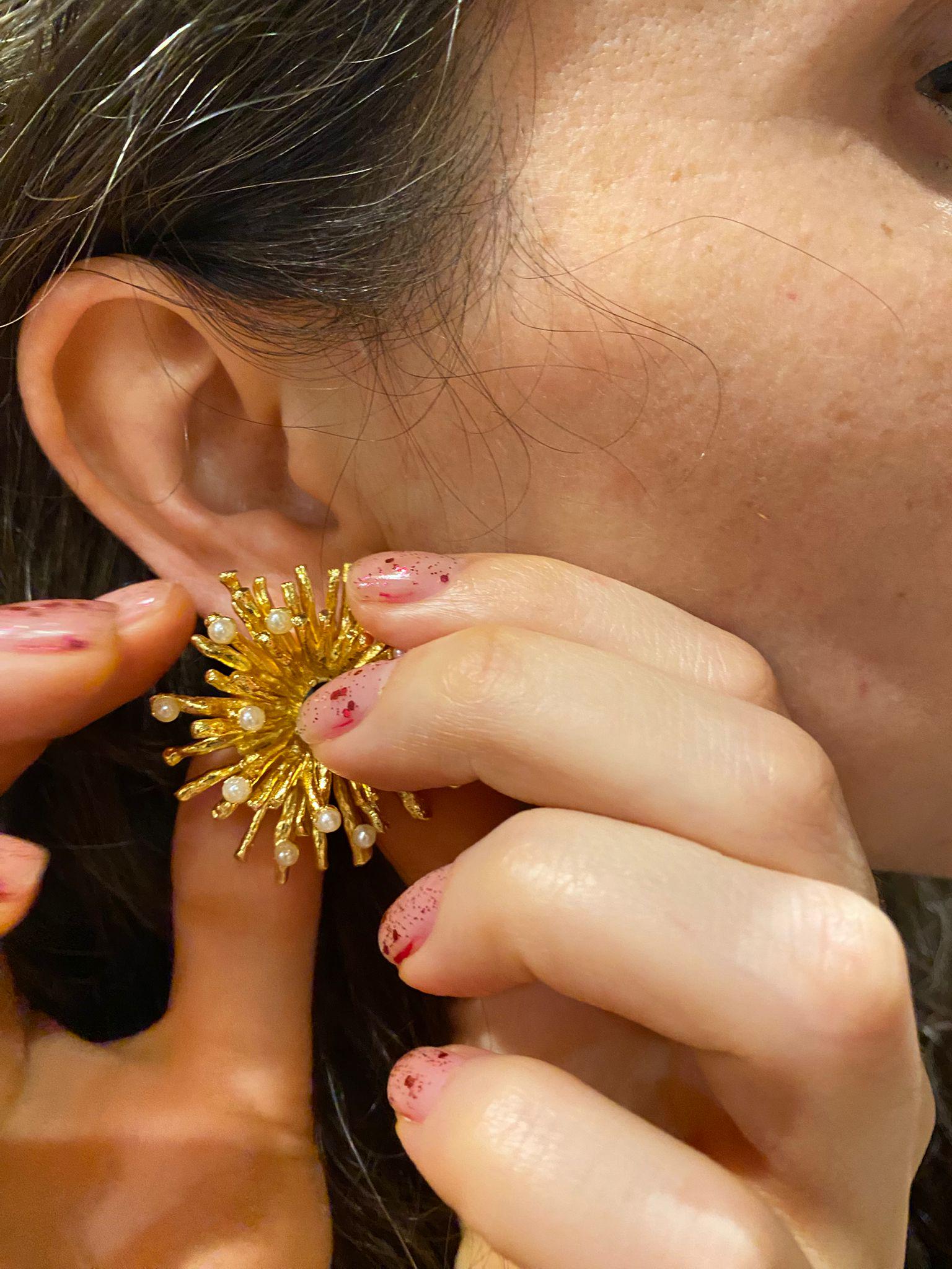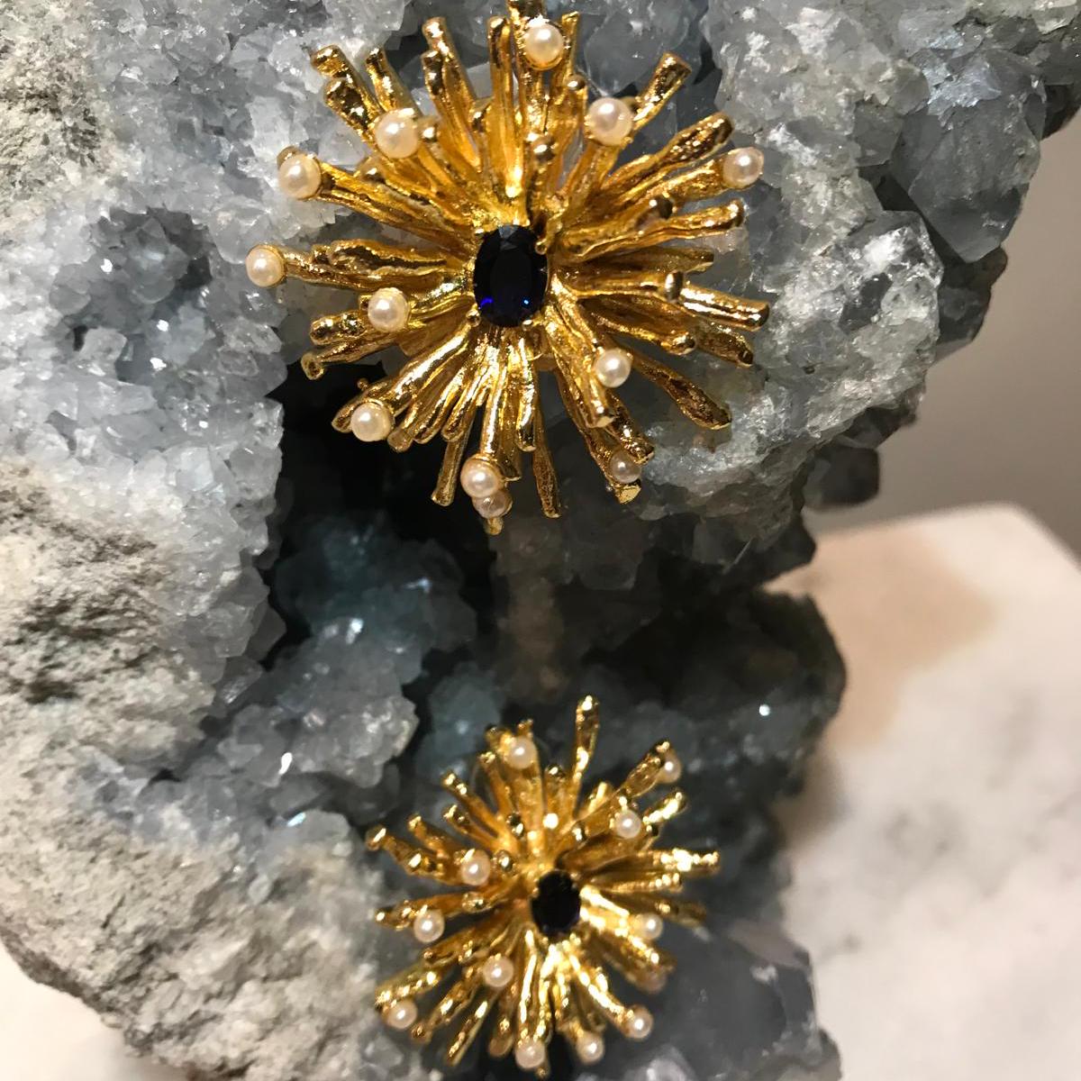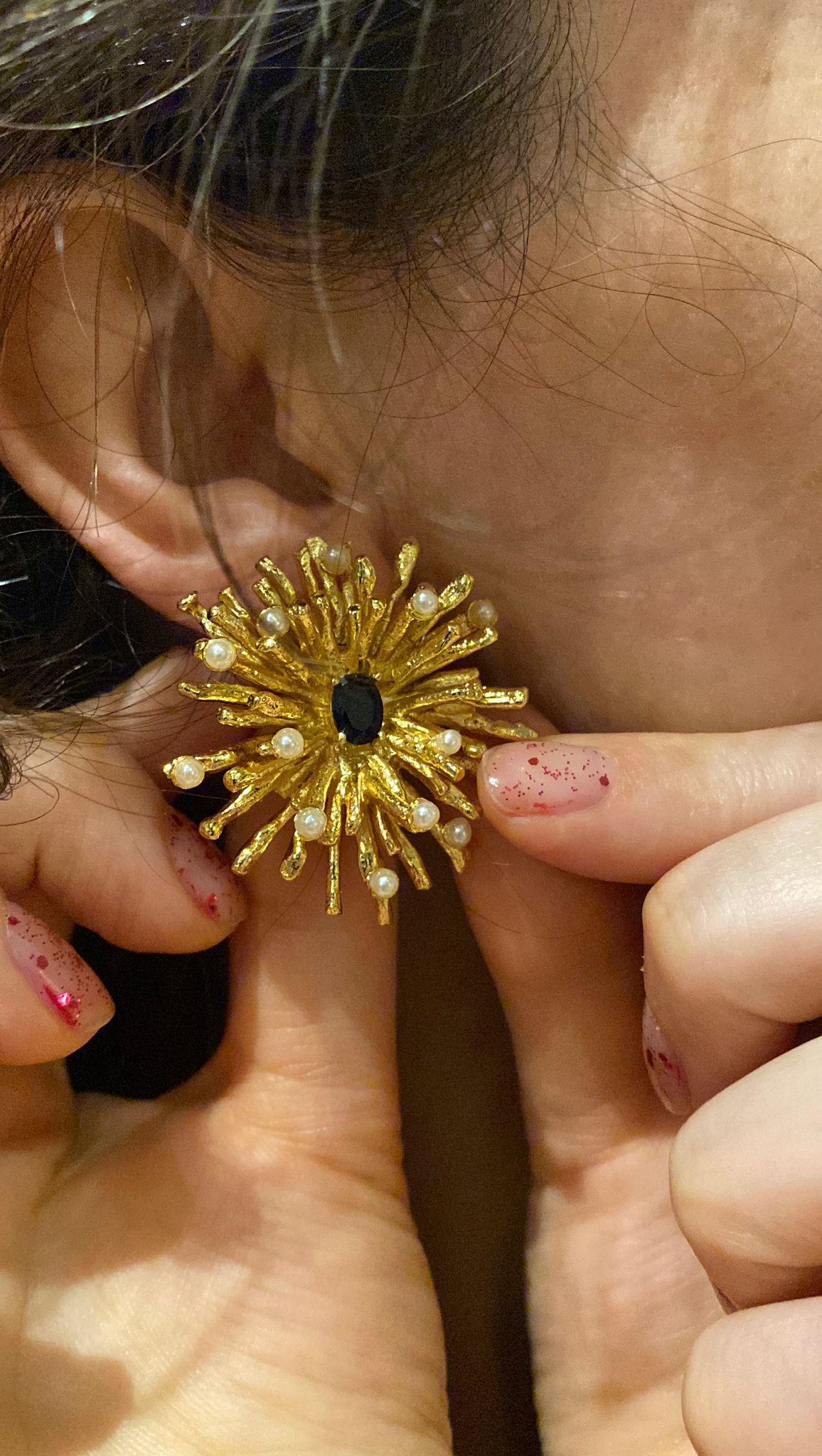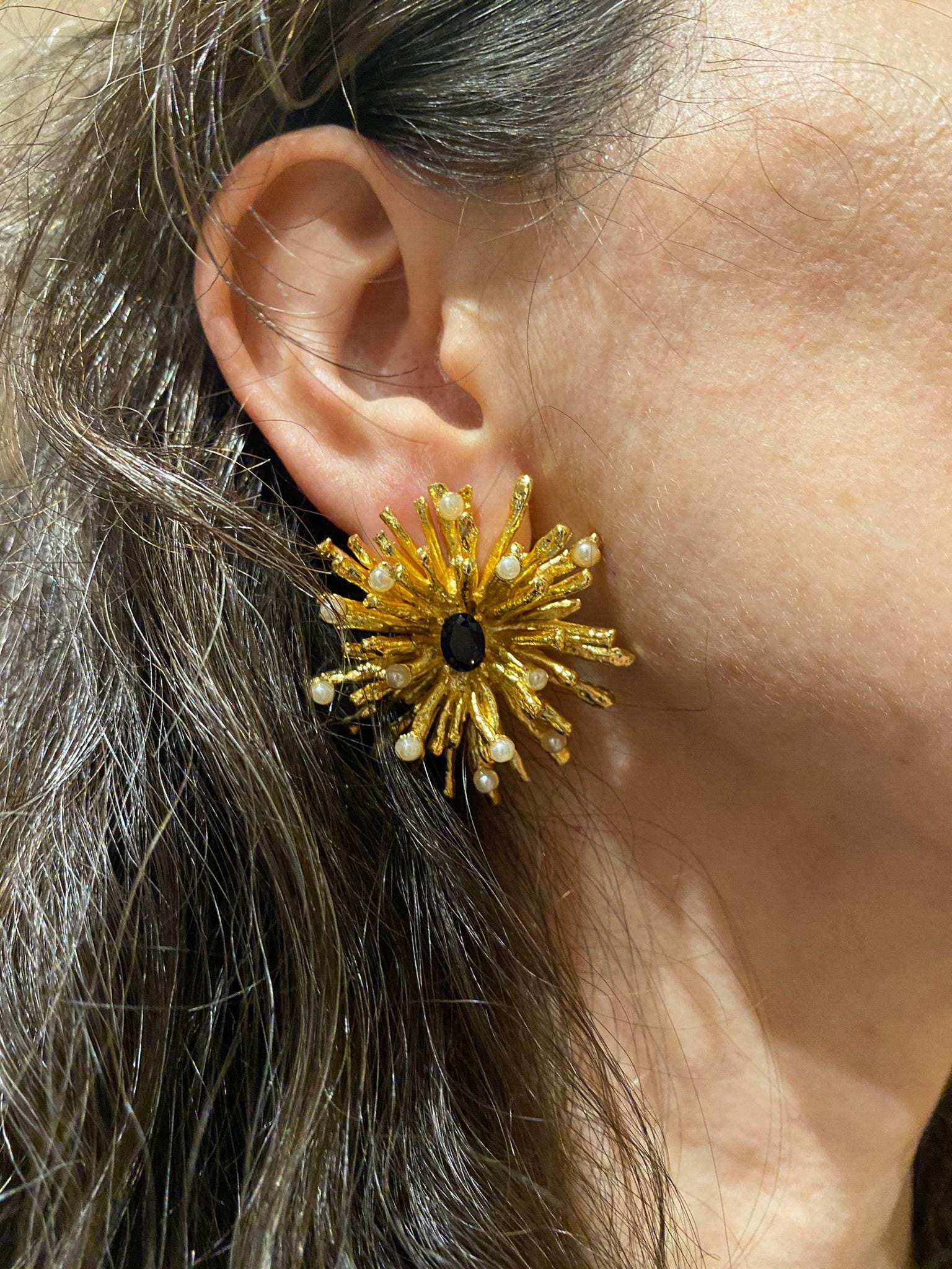 3cm.long and 3cm. Wide, handmade earrings with gold-plated bronze pearls and shiny dark blue details.