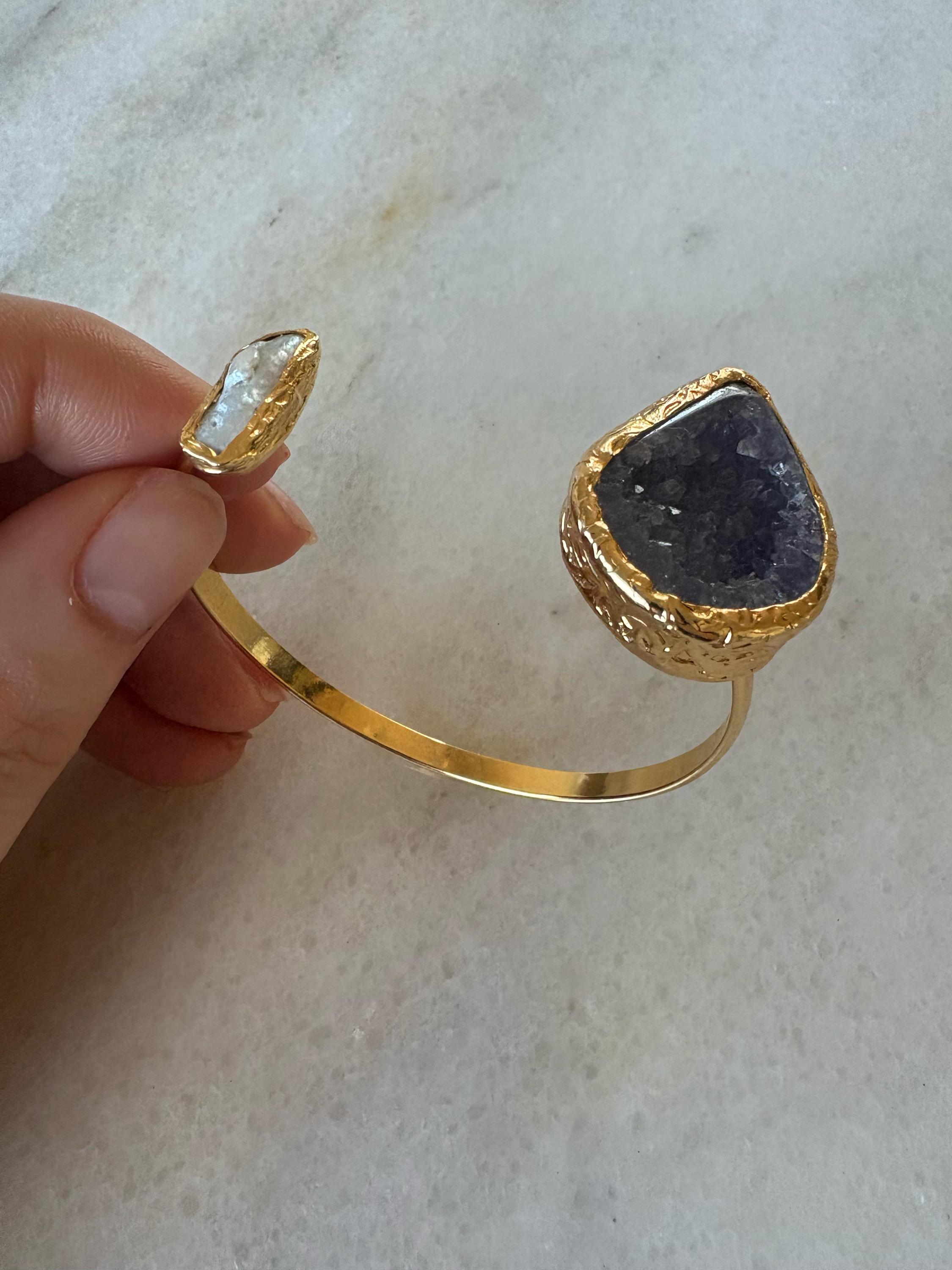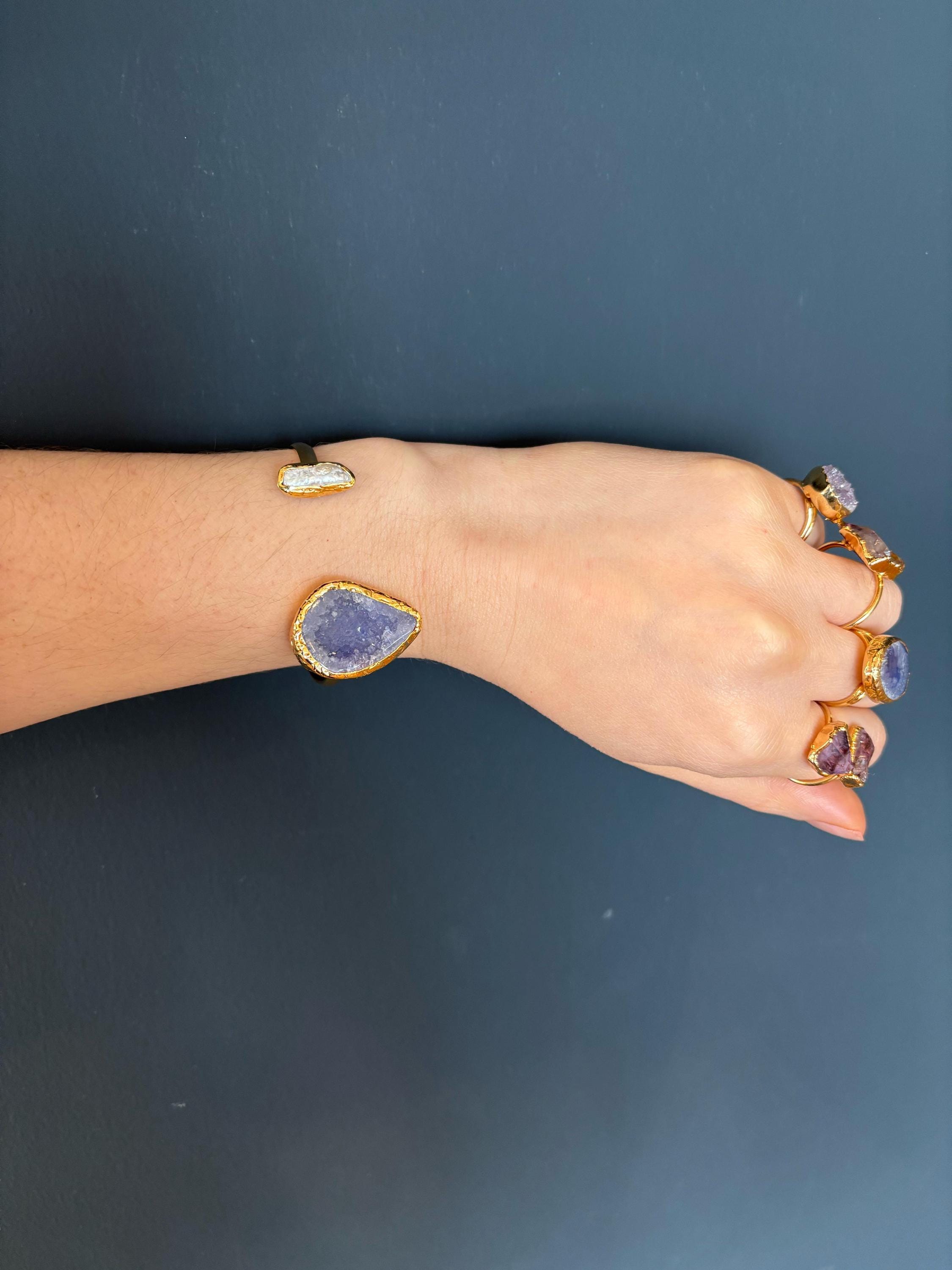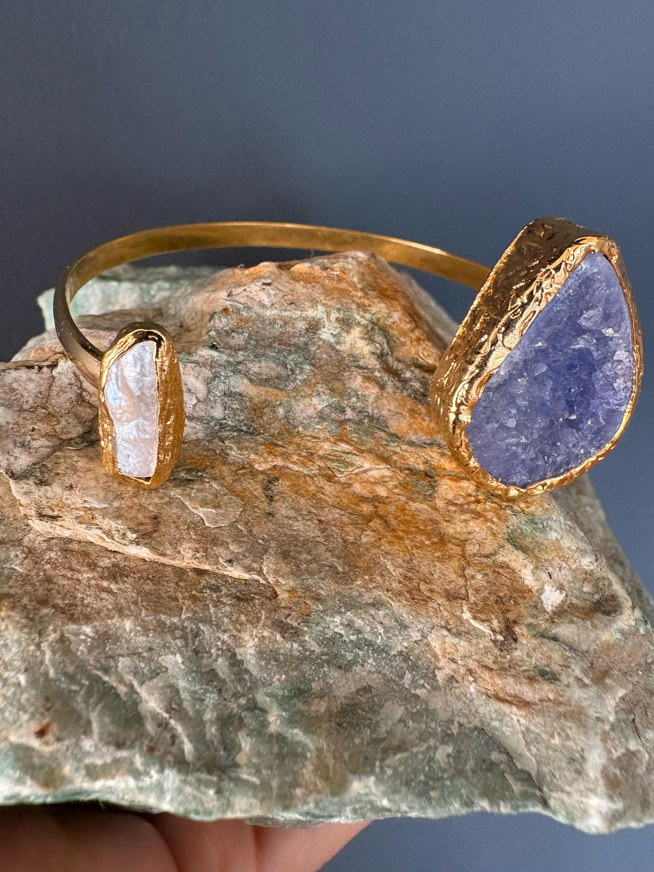 This bracelet, with gold plating over bronze, combines the elegance of pearls and the energy of amethyst. With its stylish and sophisticated design, it adds elegance to your wrist while providing a comfortable fit with its adjustable structure.