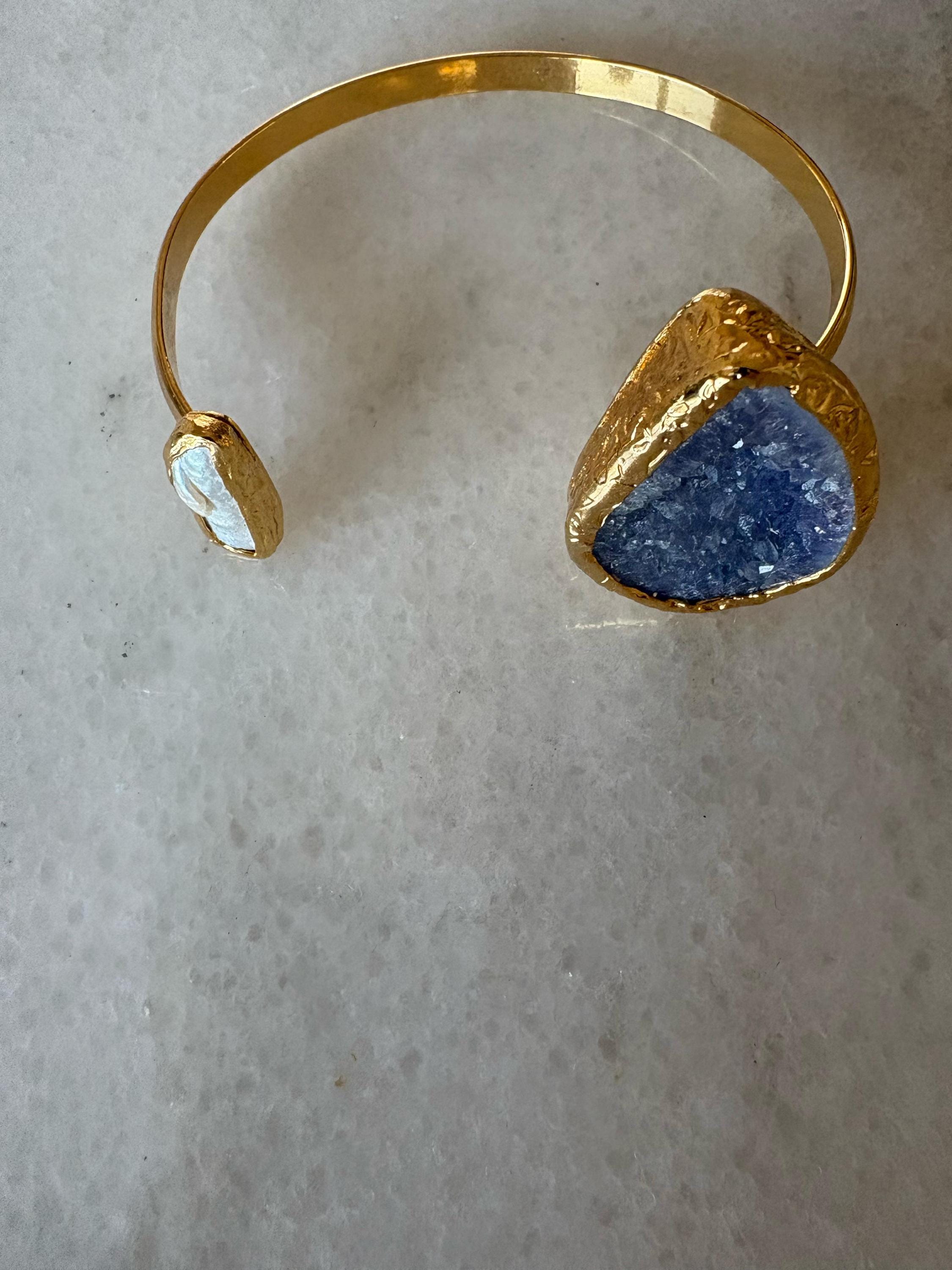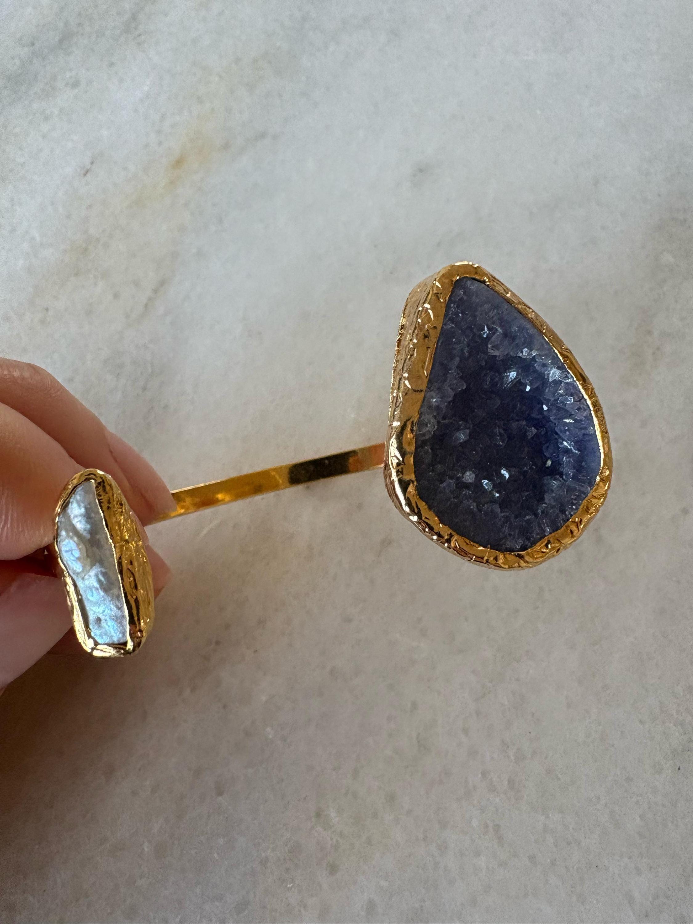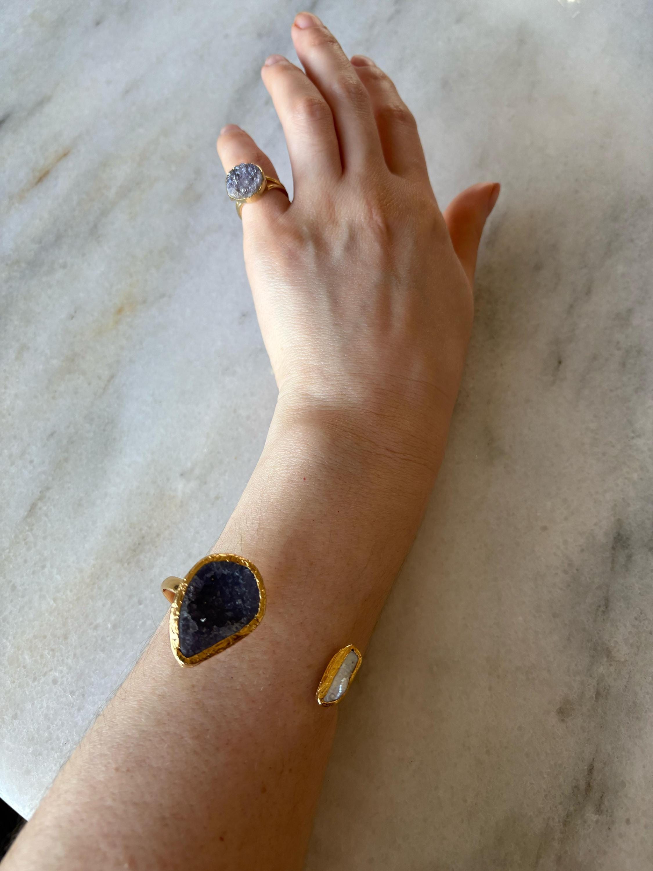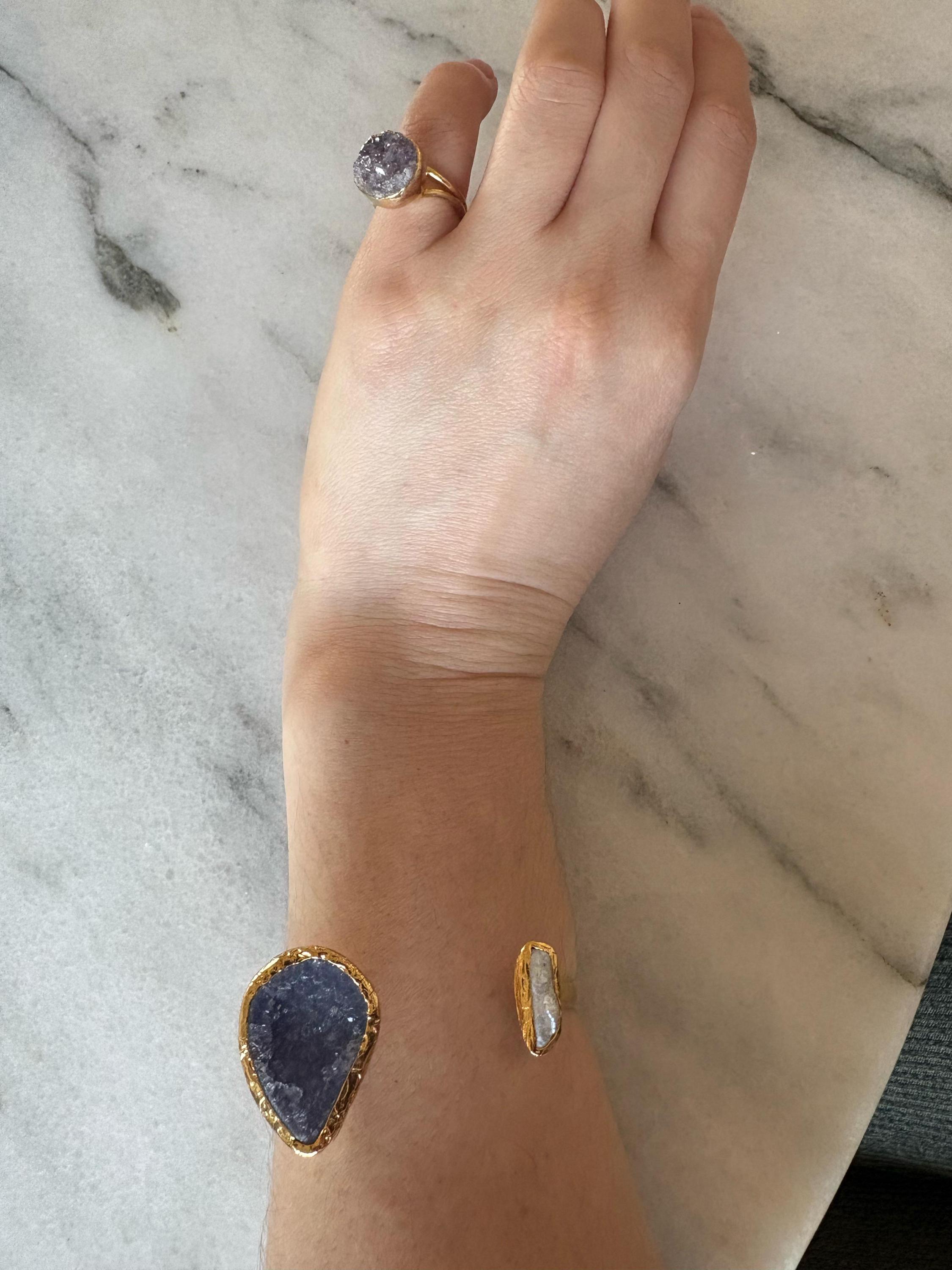 This bracelet, with gold plating over bronze, combines the elegance of pearls and the energy of amethyst. With its stylish and sophisticated design, it adds elegance to your wrist while providing a comfortable fit with its adjustable structure.