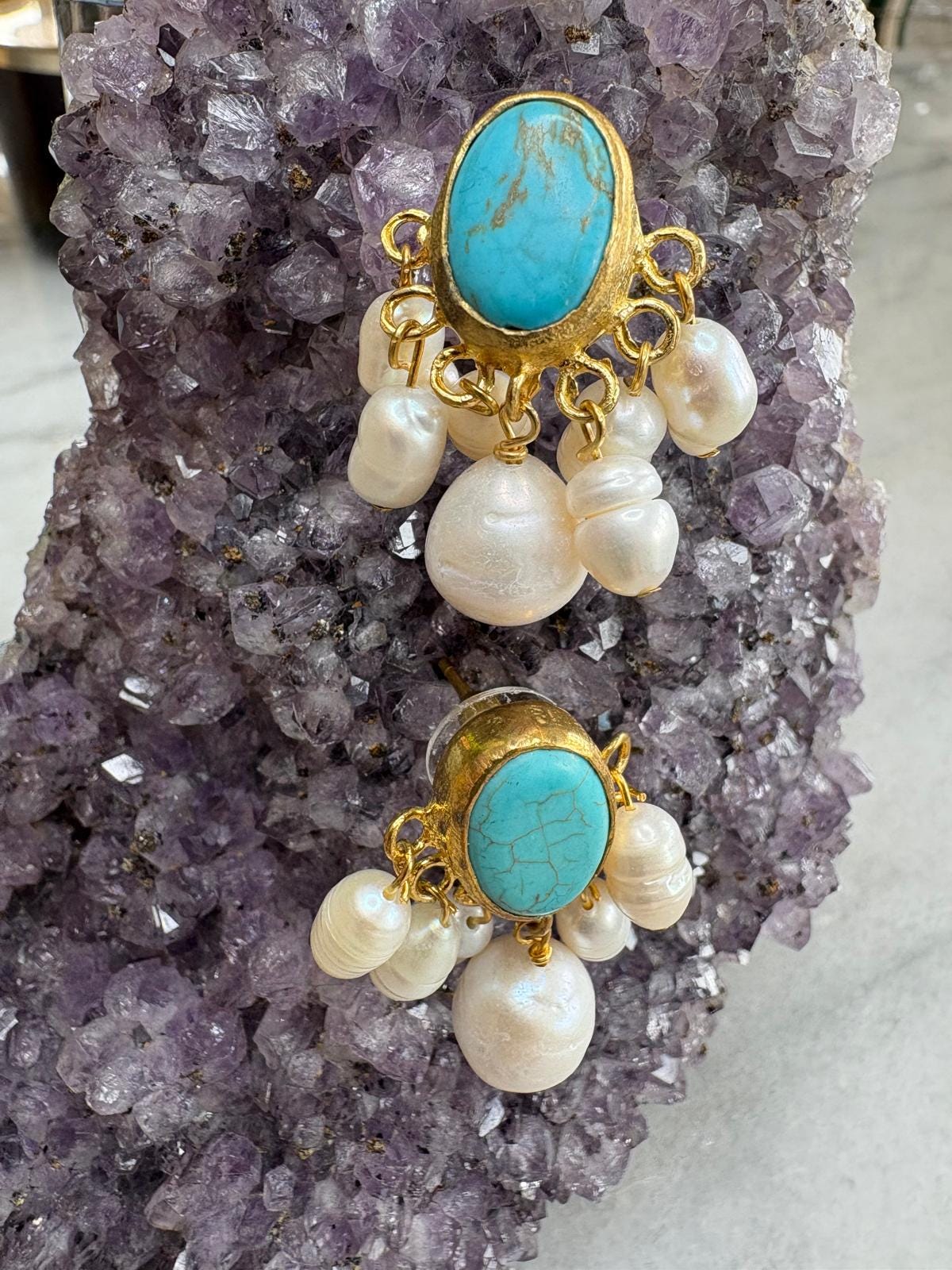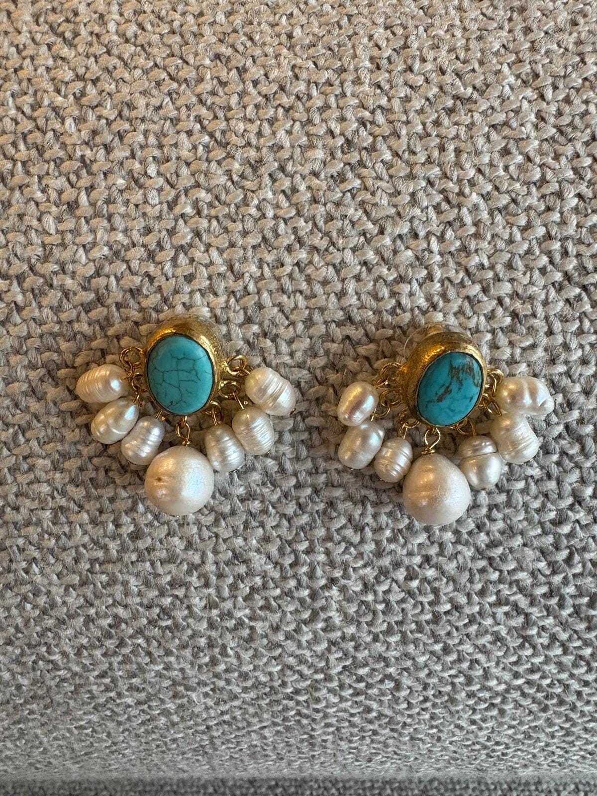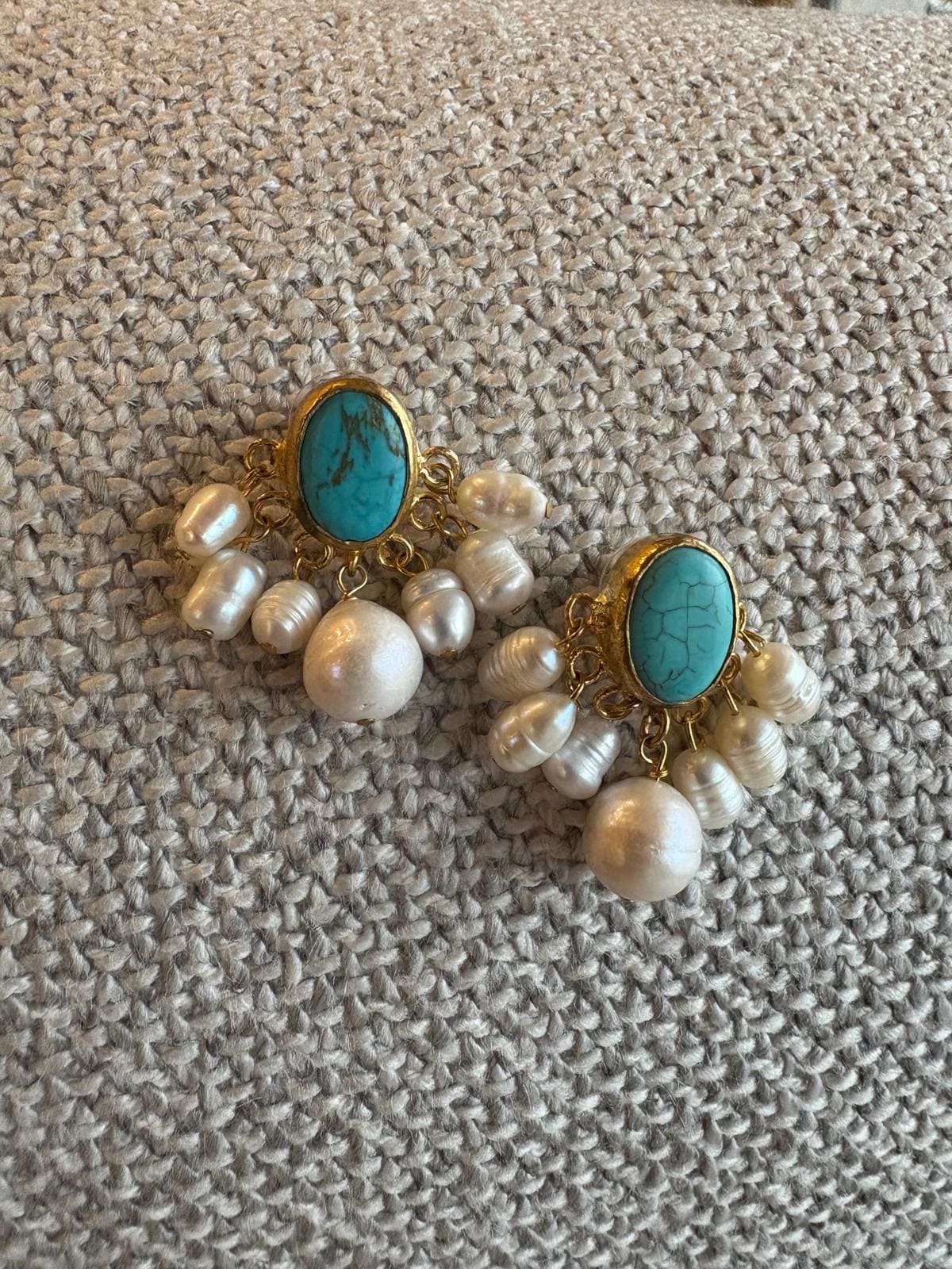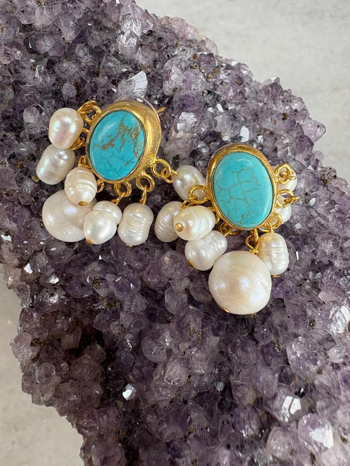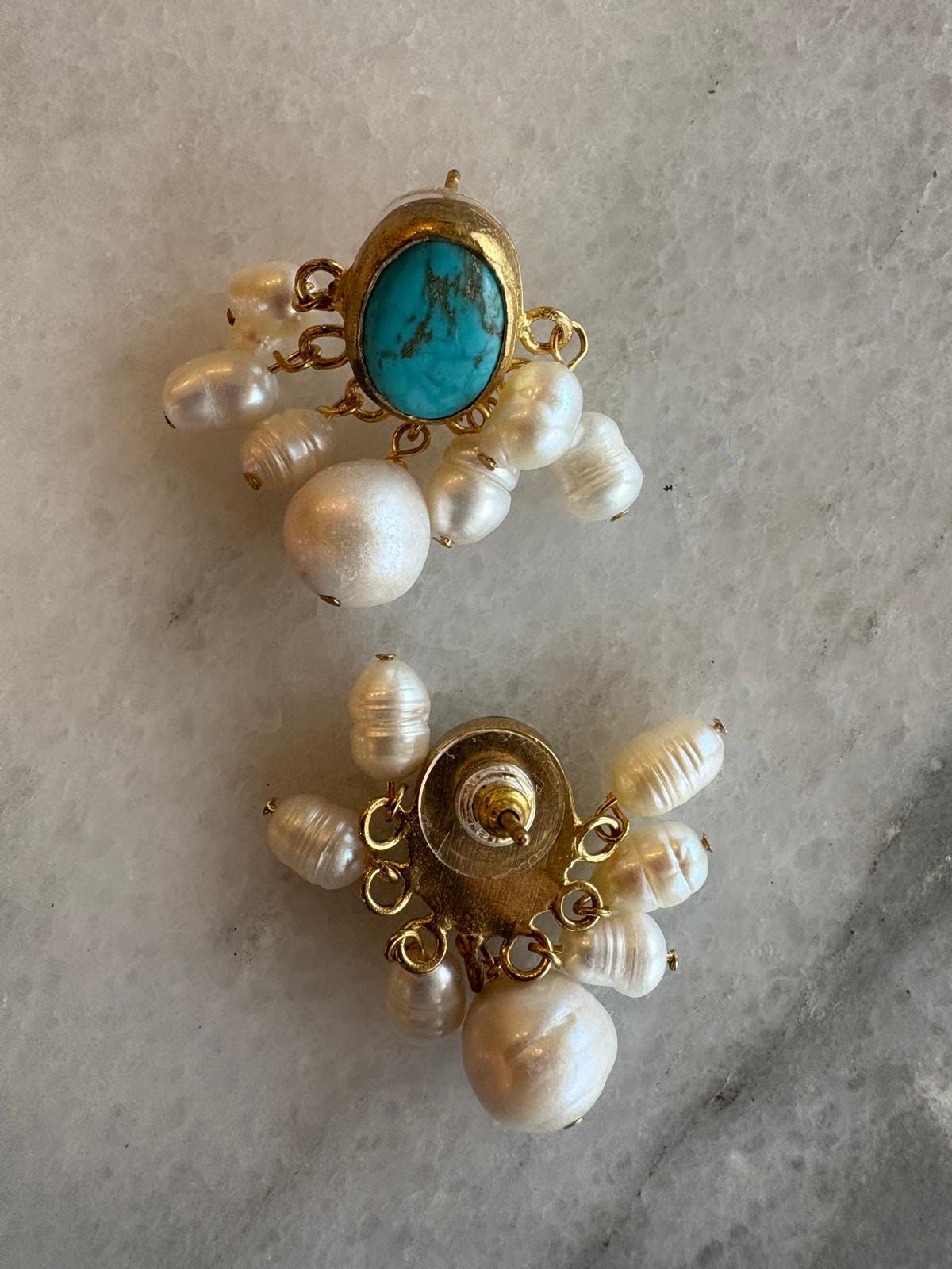 Each pair is carefully handcrafted. The turquoise stone is set in a gold-plated frame, while delicate pearls gently move beneath, adding a graceful and feminine touch.