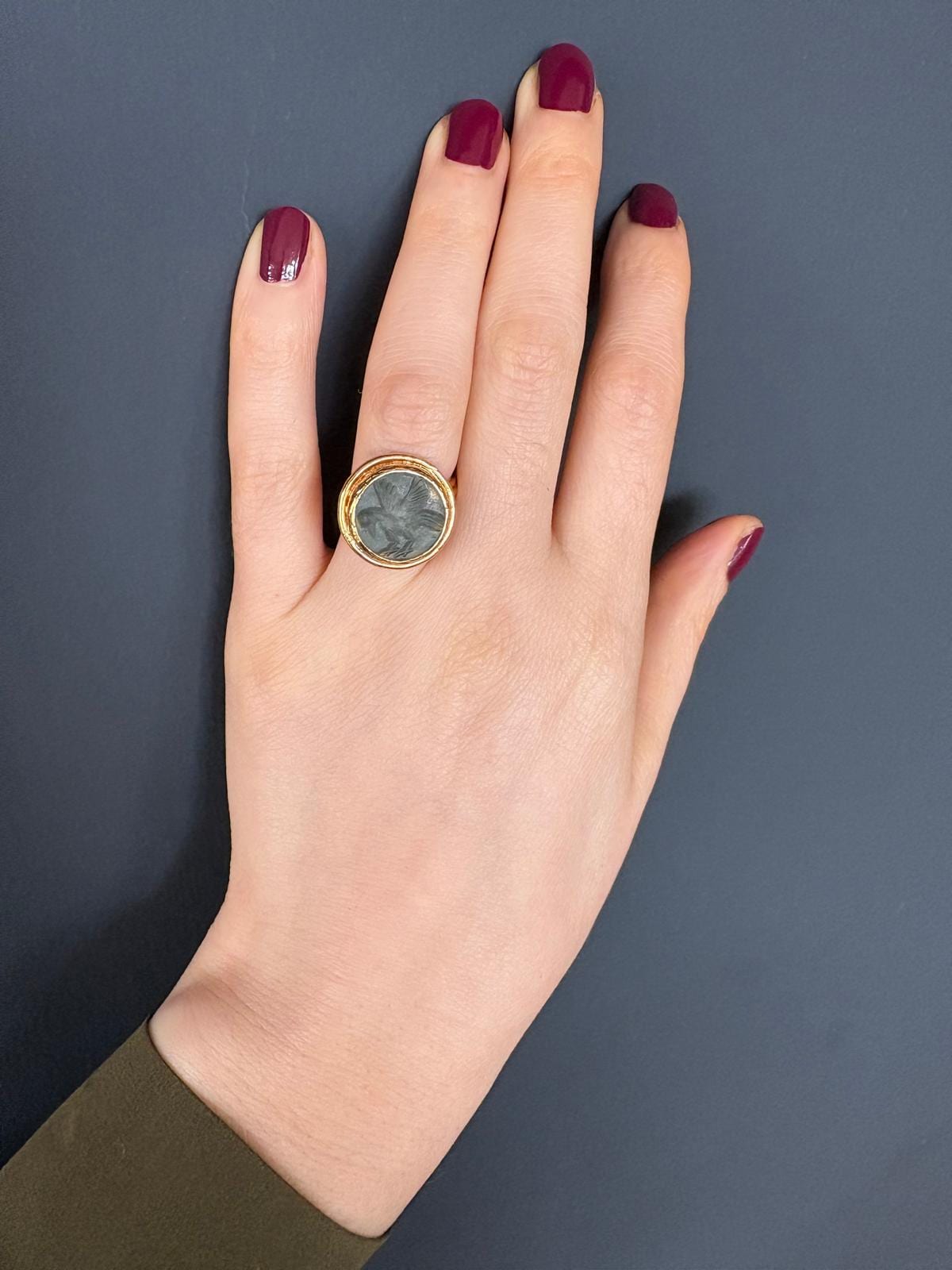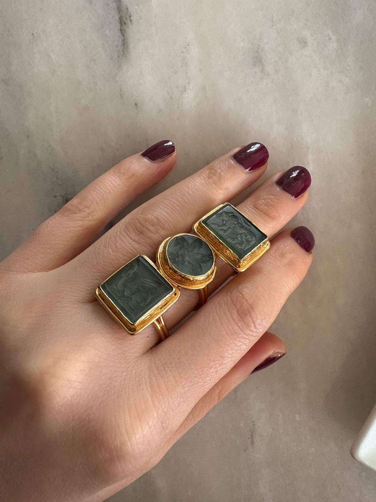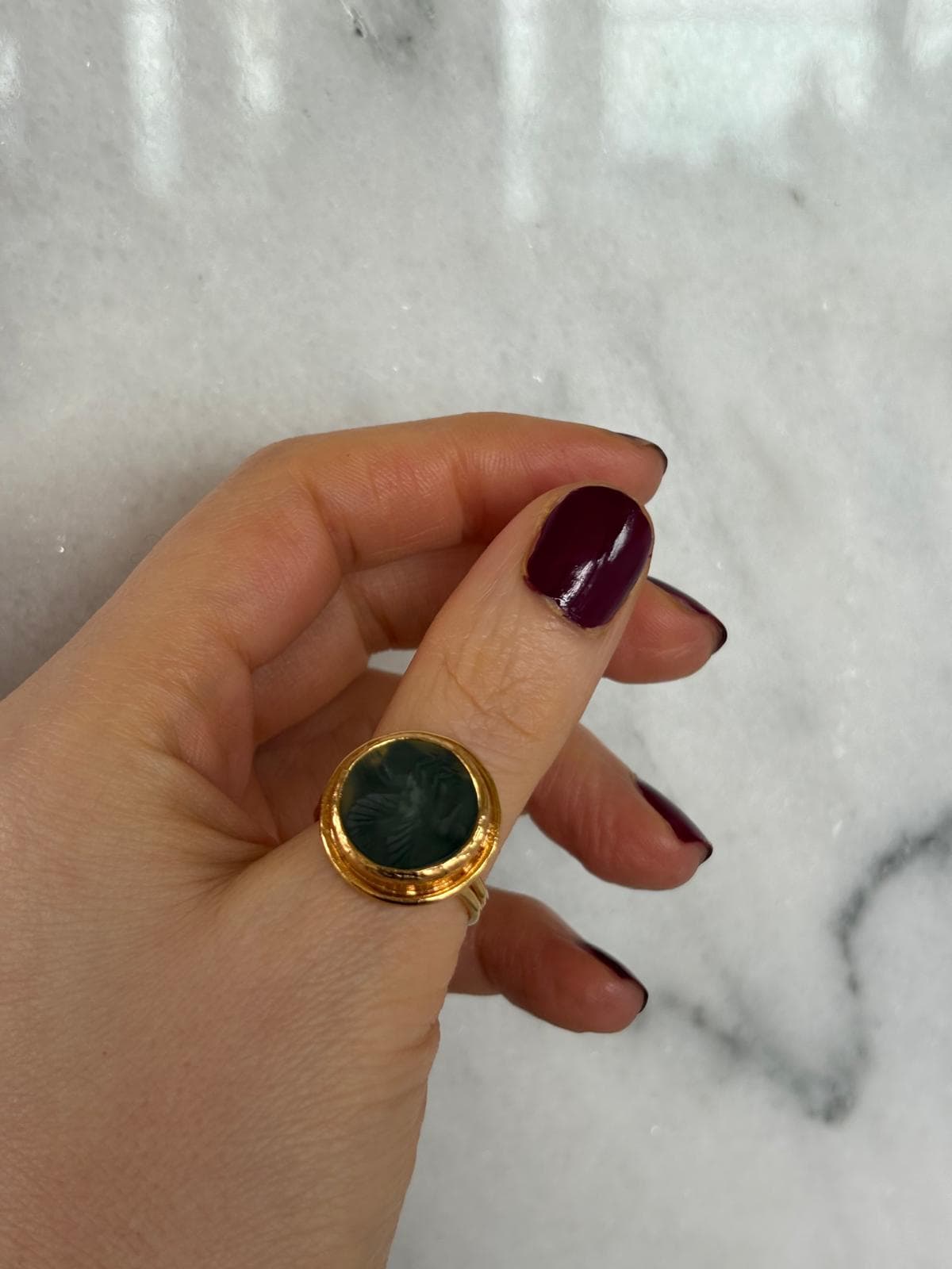 Featuring a hand-carved eagle intaglio on a deep green agate-style stone, it reflects quiet strength and timeless elegance. The subtle golden undertones within the stone reveal themselves in the light—never loud, always captivating.
