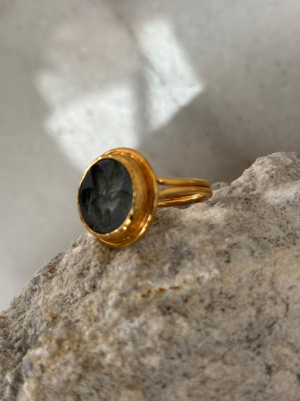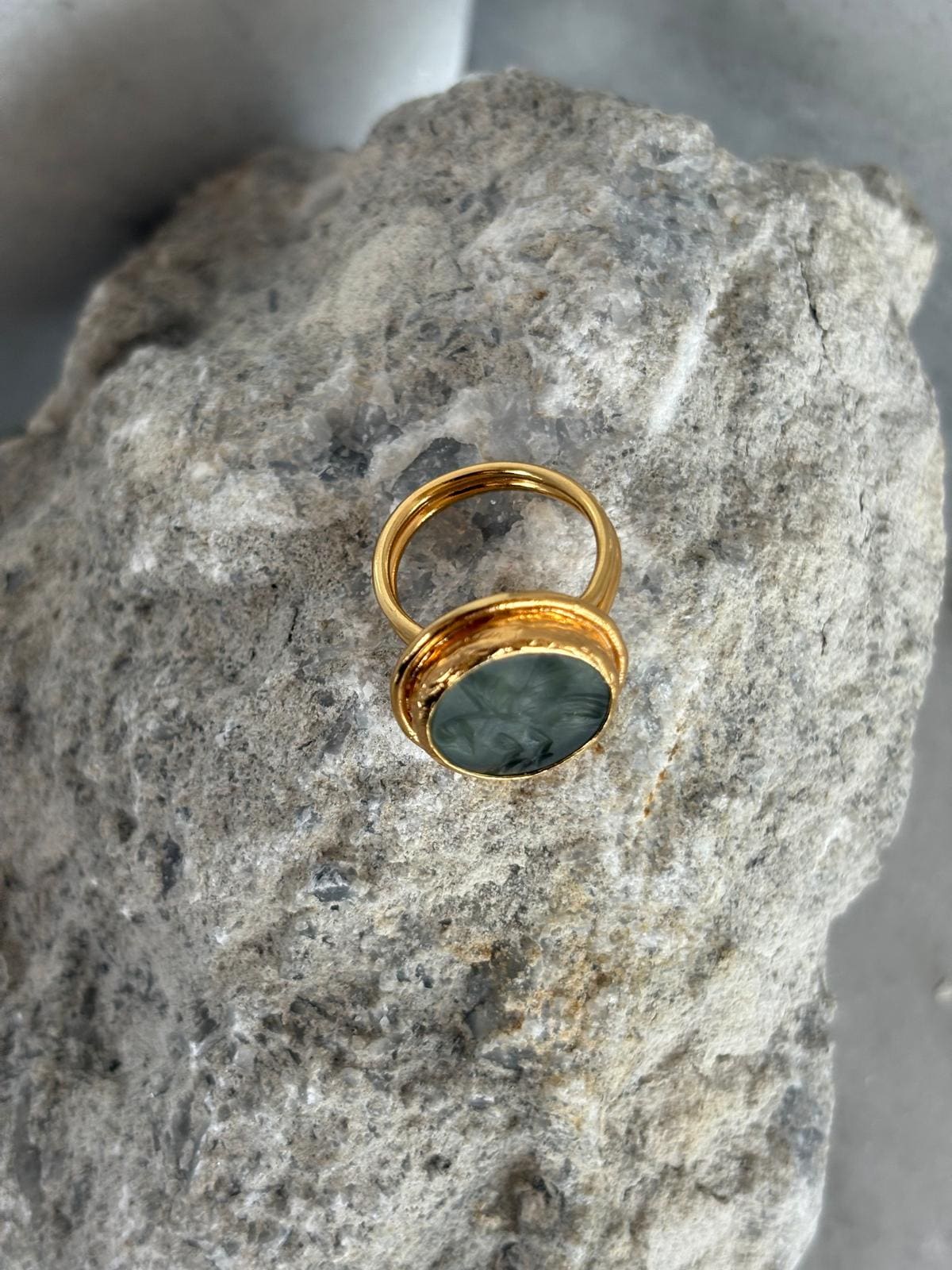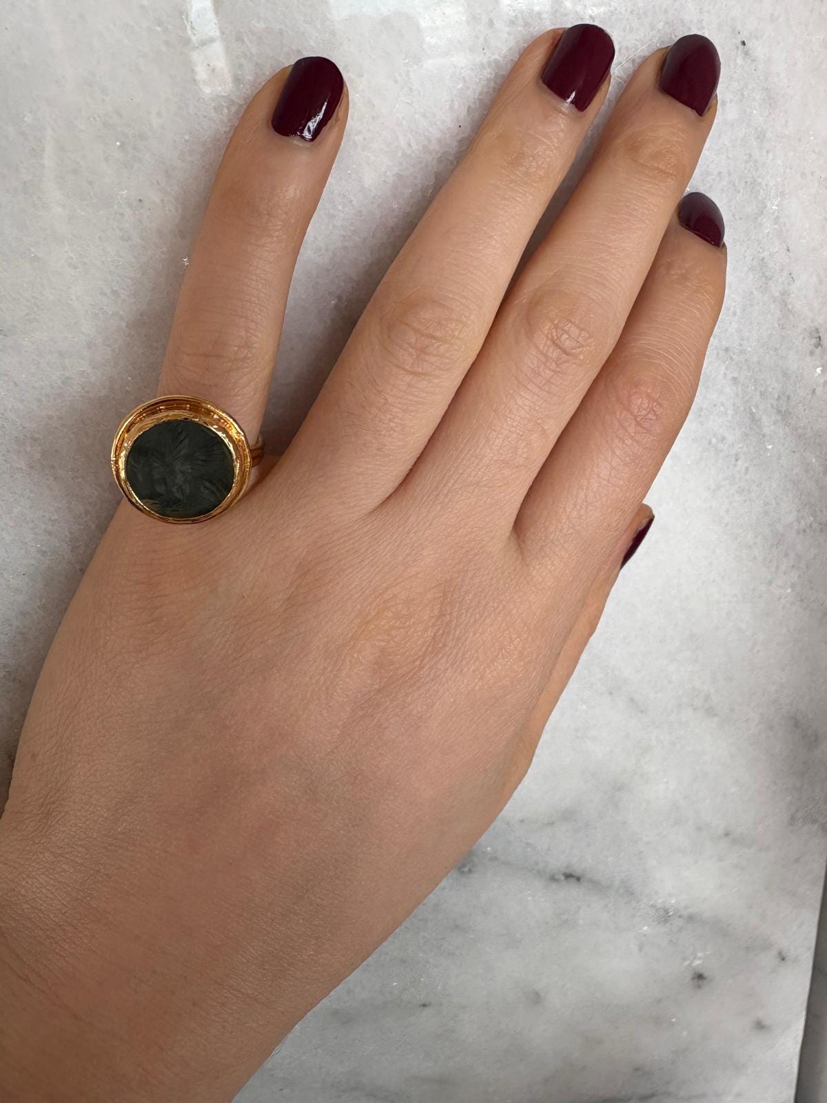 Featuring a hand-carved eagle intaglio on a deep green agate-style stone, it reflects quiet strength and timeless elegance. The subtle golden undertones within the stone reveal themselves in the light—never loud, always captivating.