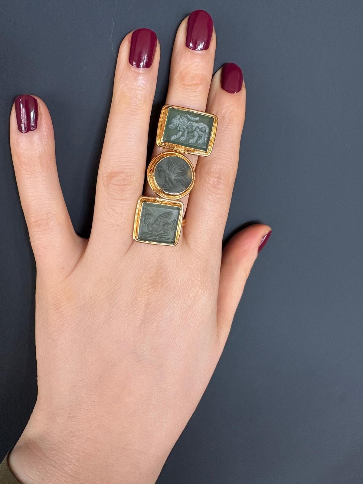 Eagle Intaglio Adjustable Gold Plated Bronze – Green Agate Signet Style, Statement Jewelry, Unique Gift for Her