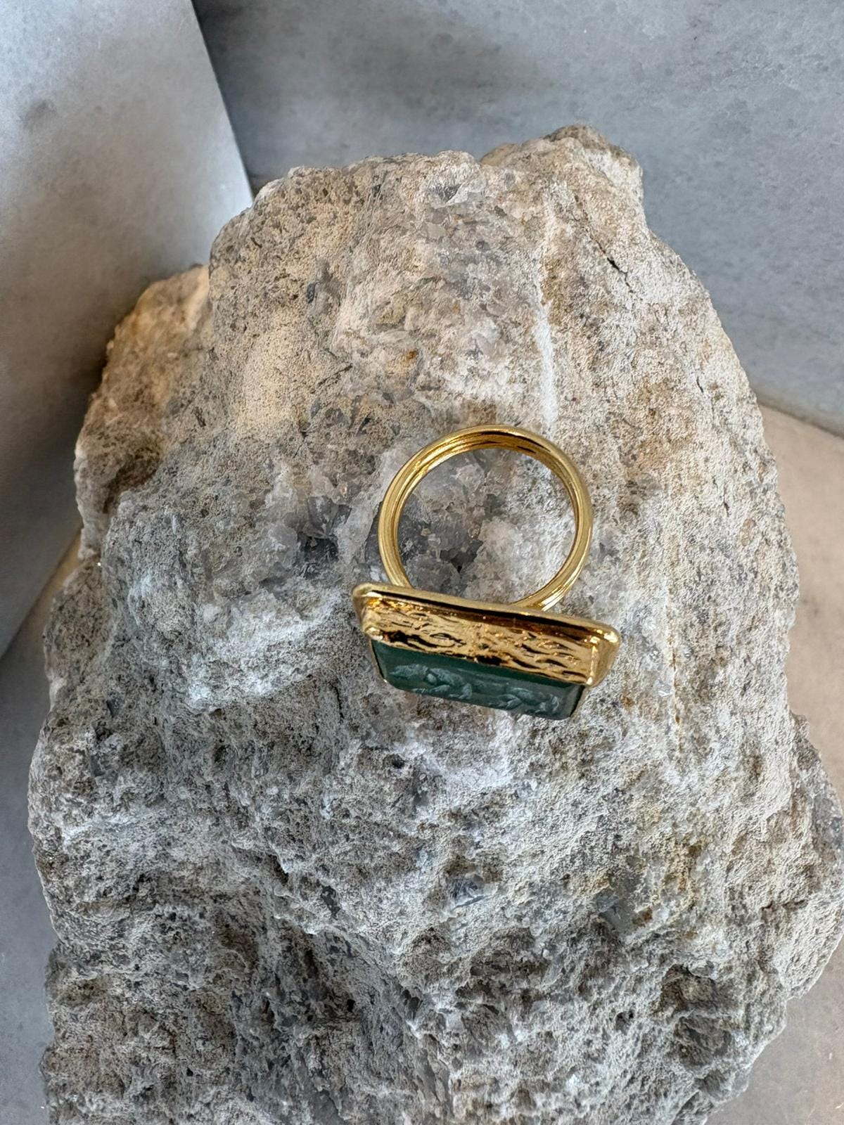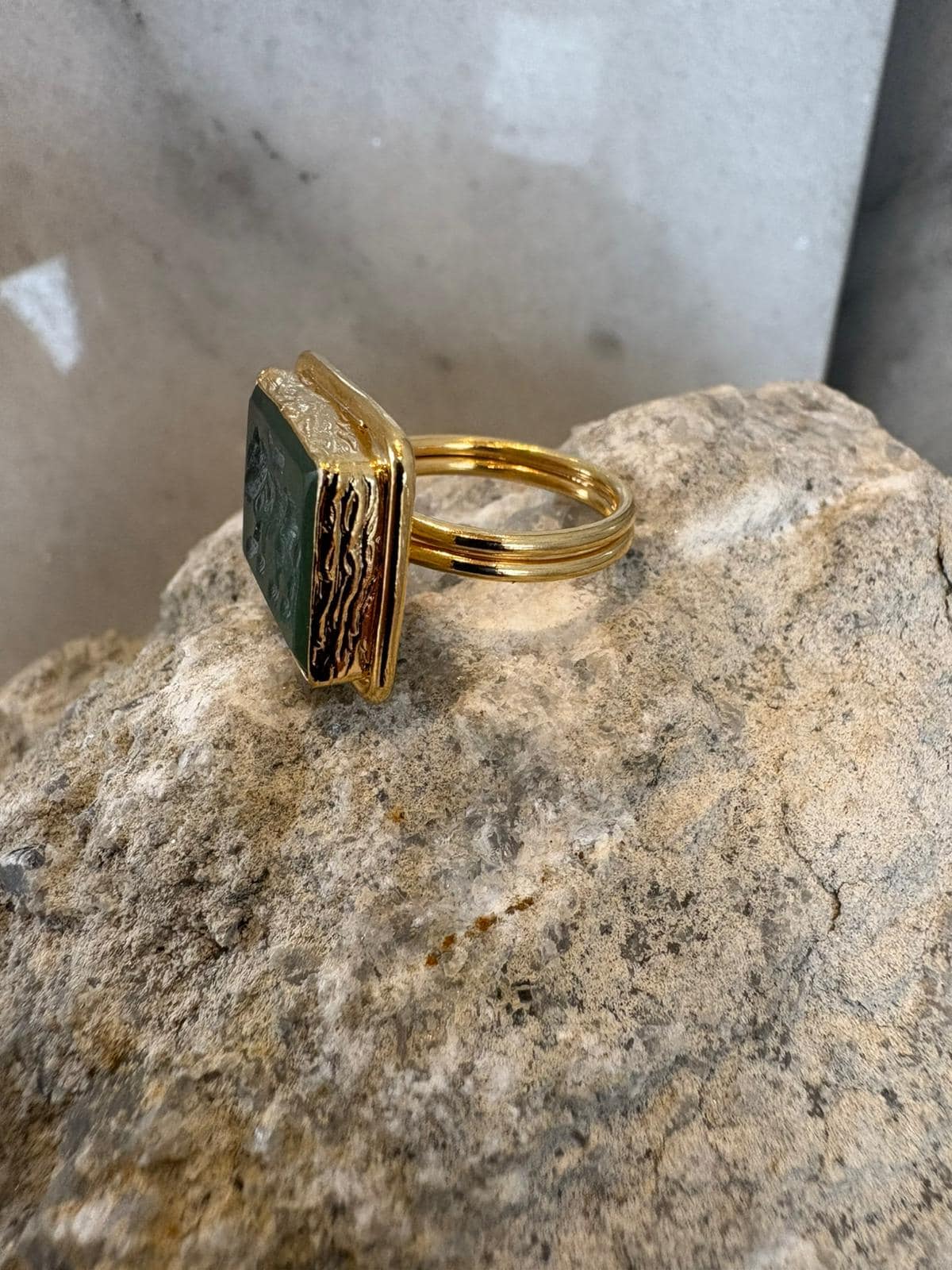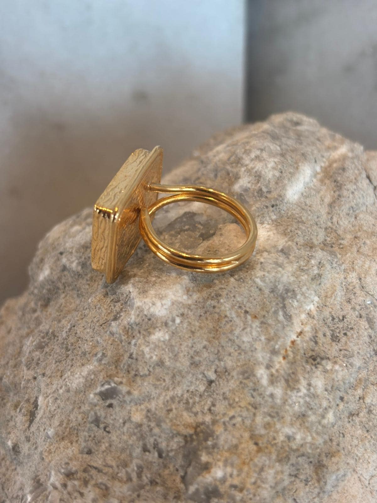 The gold-plated bronze structure offers a warm, bold presence, while the rectangular form draws inspiration from classic signet rings. A perfect balance of modern and vintage style makes it effortlessly versatile for any look.