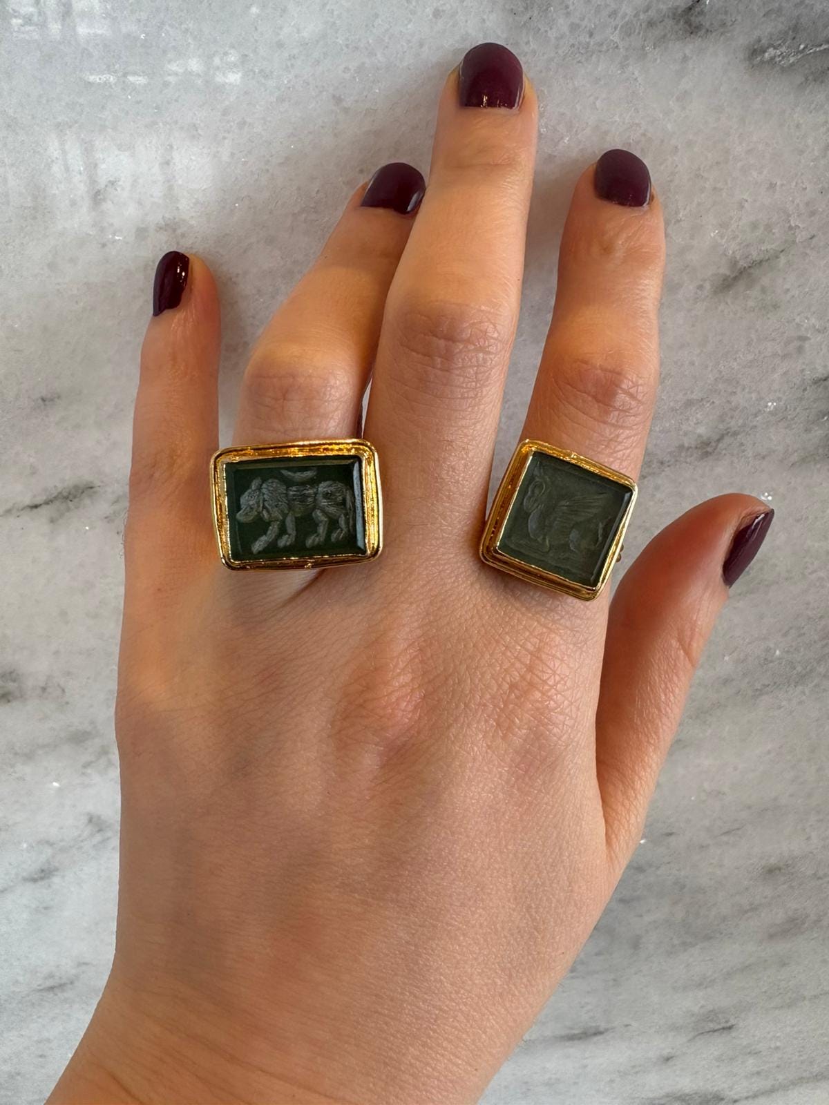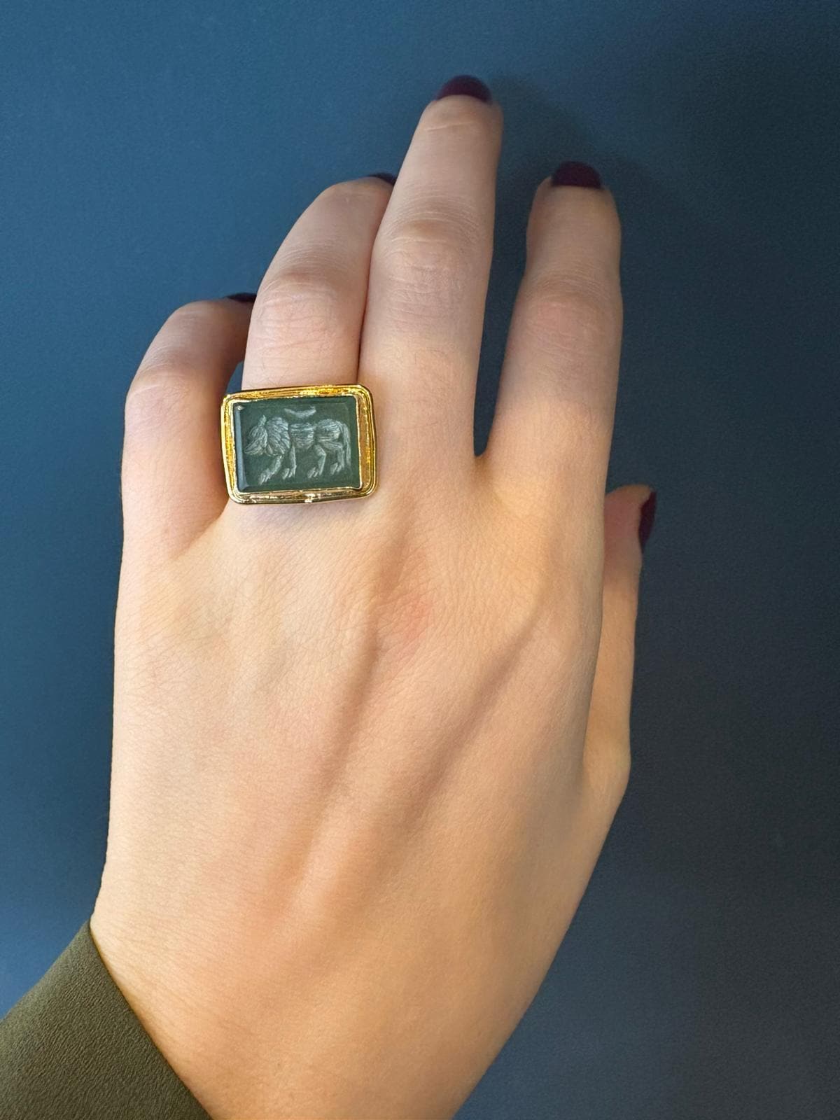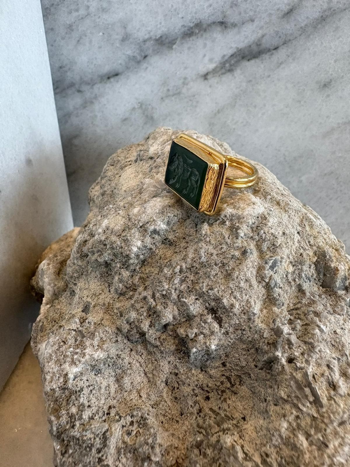 The gold-plated bronze structure offers a warm, bold presence, while the rectangular form draws inspiration from classic signet rings. A perfect balance of modern and vintage style makes it effortlessly versatile for any look.