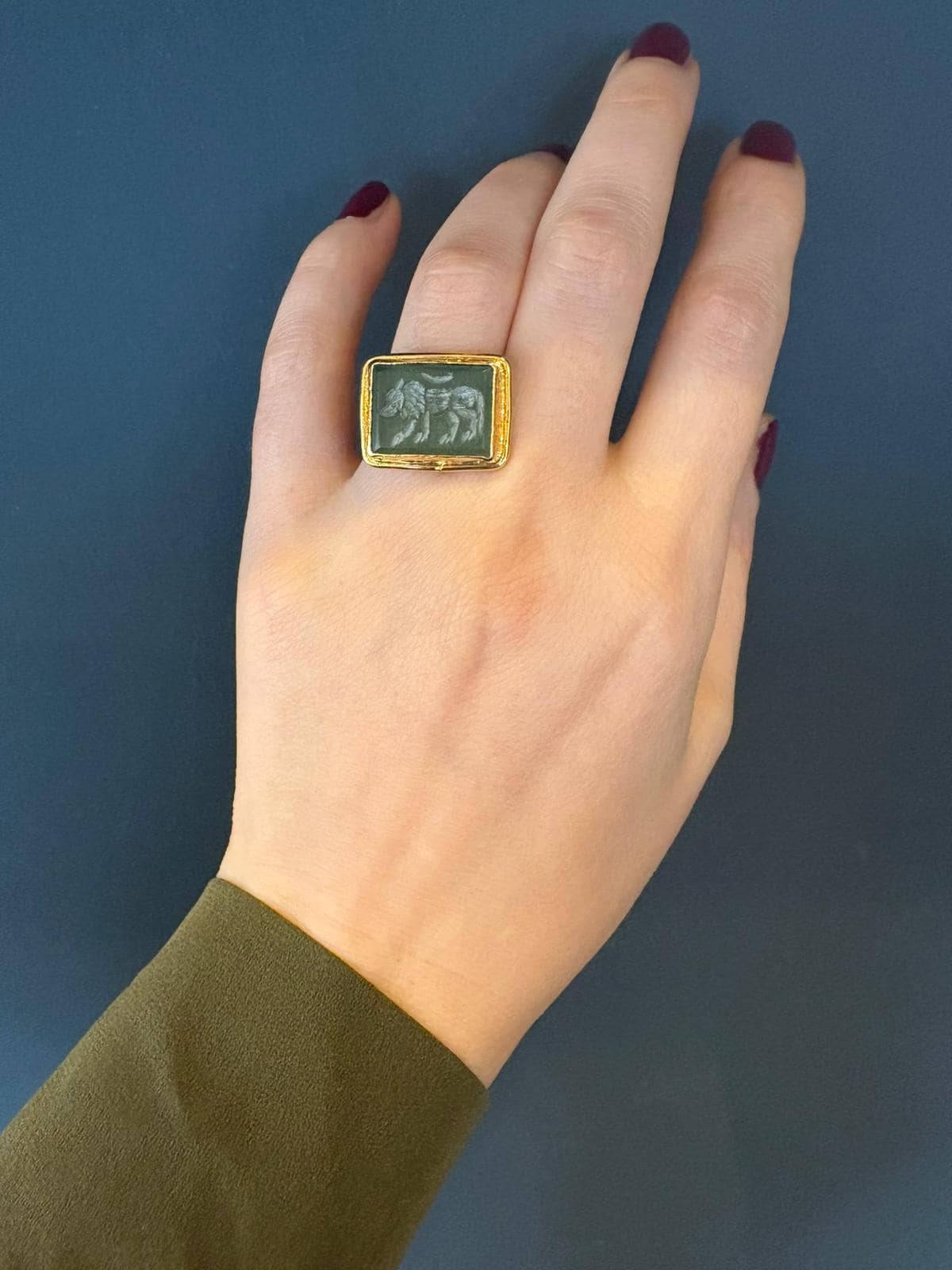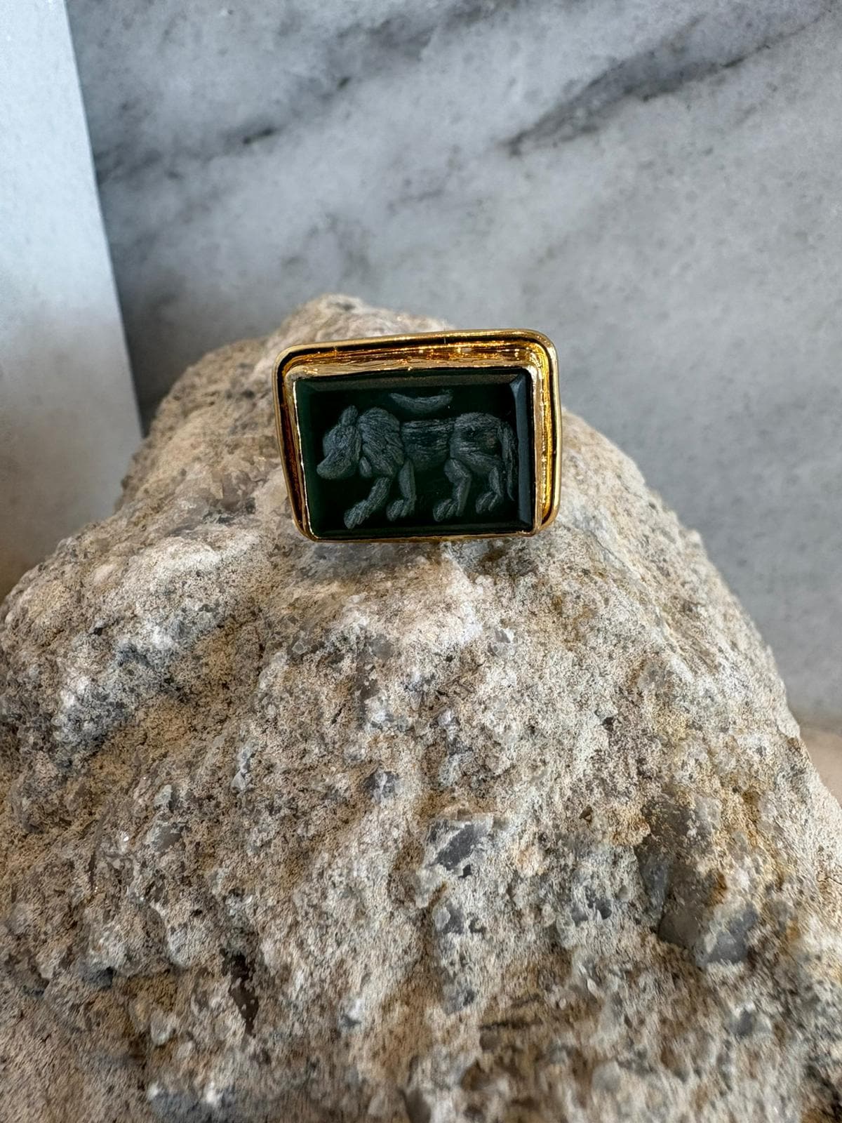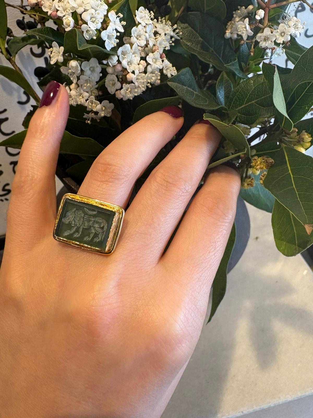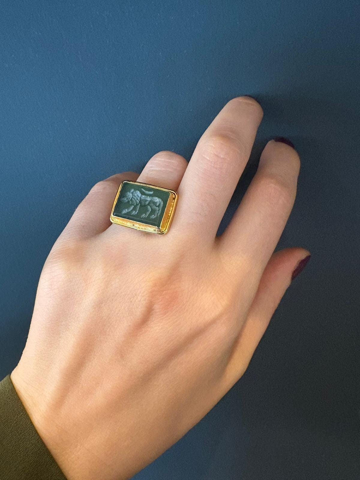 The deep green agate stone has been associated for centuries with balance, protection, and inner strength. The finely detailed lion motif represents courage, leadership, and the power to forge your own path.